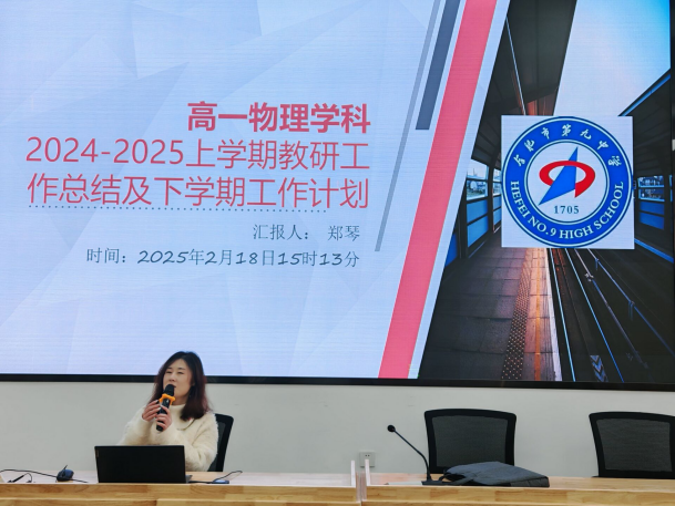 高一年级教研组长郑琴老师则是就过去一学期高一物理组取得的成绩做了汇总,展现了高一物理组在教学、教研、学生培养等多方面的卓越表现,赢得了在场教师的广泛赞誉。在过去一学期,高一物理组全体教师致力于提升课堂教学质量,通过精心设计教学方案、优化教学方法,使学生对物理学科的学习兴趣和学习效果得到了显著提升。同时高一物理组积极开展各类教研活动,取得了丰硕的教研成果。教师们积极参与学校的公开课、示范课活动,展示了多节高质量的物理课,受到了同行和专家的一致好评。