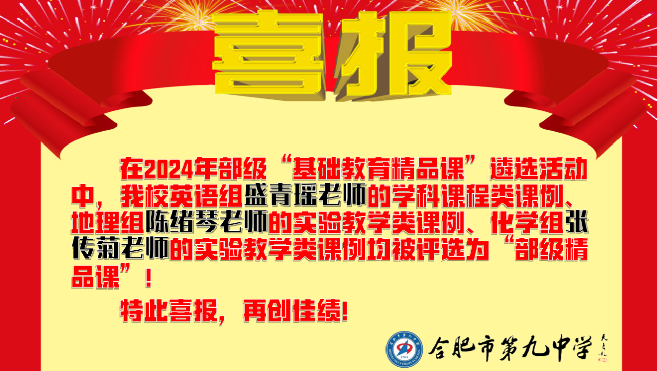 近日,教育部公布了“基础教育精品课”评选结果,合肥九中的三名教师凭借卓越的教学水平和精心打磨的课程,成功斩获“部级精品课”荣誉,为学校的教育教学工作再添光彩。