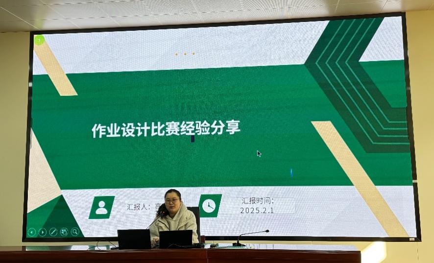 高淋老师进行作业设计分享时,就这一新的比赛形式向组内老师们分享参赛经验,根据教学目标和学生的实际情况,将作业分为基础巩固、能力提升和拓展创新三个层次。