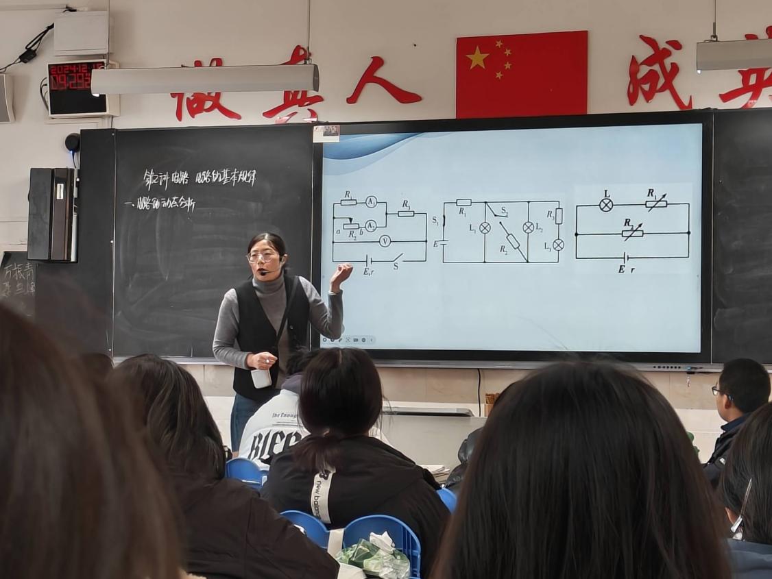 李春萍、余礼忠、贾良慧和何佳骥四位老师分别就不同的课题展开电路问题教学。李春萍老师重点教授学生如何将复杂的电路简化为等效电路图,以便更容易理解和分析电路,这包括识别并合并串联和并联的电阻、电容等元件。此外,李春萍老师还特意讲解了含有电容器的有关电路计算问题。