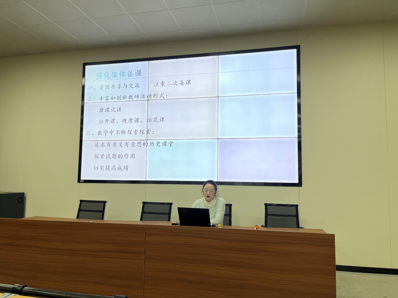 高二年级教研组长李媛媛老师进行了组内教研成果的阶段总结,并对历史学科特色活动提供了建议。李媛媛展示了组内教师获得的荣誉和指导学生获奖情况,并建议依托合肥市历史学科素养实践活动,组织开展历史文化节,探索历史课外实践活动。