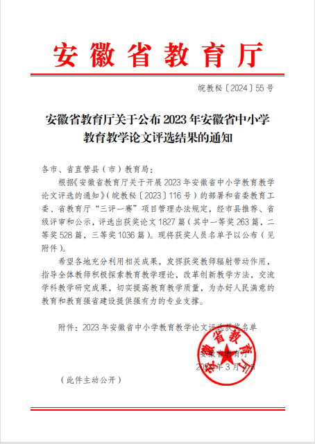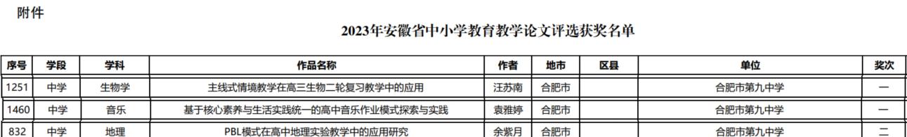 今年上半年,根据安徽省教育厅发布的文件《关于公布2023年安徽省中小学教育教学论文评选结果的通知》,经合肥市推荐、省级评审和公示,合肥九中在安徽省教育教学论文评选中共有3位教师脱颖而出。其中,生物教师汪苏南、音乐教师袁雅婷荣获省级一等奖,地理教师余紫月荣获省级二等奖!
