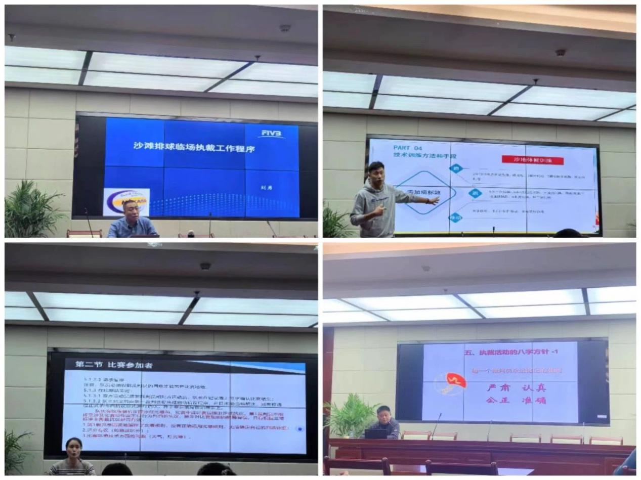 培训首日,由国家级裁判马倩老师为大家解读沙滩排球的基本规则,使大家对沙滩排球规则有了初步了解;次日及第三天,由国际级沙滩排球裁判员刘勇老师讲授沙滩排球执裁时的细节,特别是其自身在国际大赛执裁时的经验对裁判员的成长起到了很大的作用;之后由江苏省女子沙滩排球教练员殷瑞老师进行了沙滩排球训练方法的教授,使各位教练员接触到了先进的训练理念和方法;最后由杨伟杰老师讲授体育竞赛裁判员管理办法。