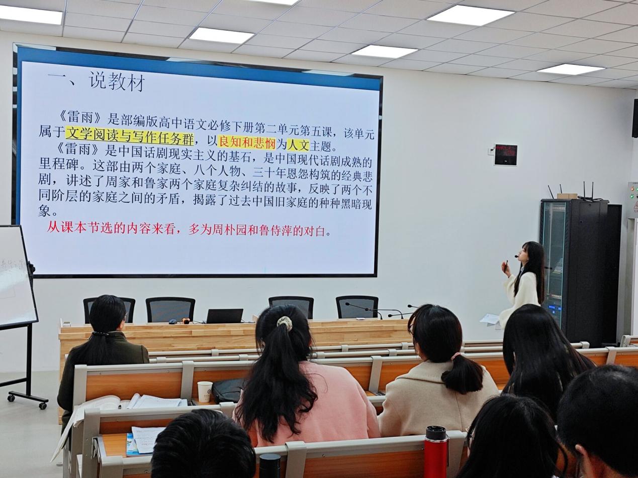 王冯秋池老师带来了《雷雨》的说课内容,从弦外之音、推动情节、揭示性格三个角度揭示周朴园这个圆形立体的人物形象,带领学生深入感知“良知与悲悯”的人文主题,使参会教师深刻领会立德树人教学根本的现实意义,为帮助学生认识真实社会提供了思考的方向。