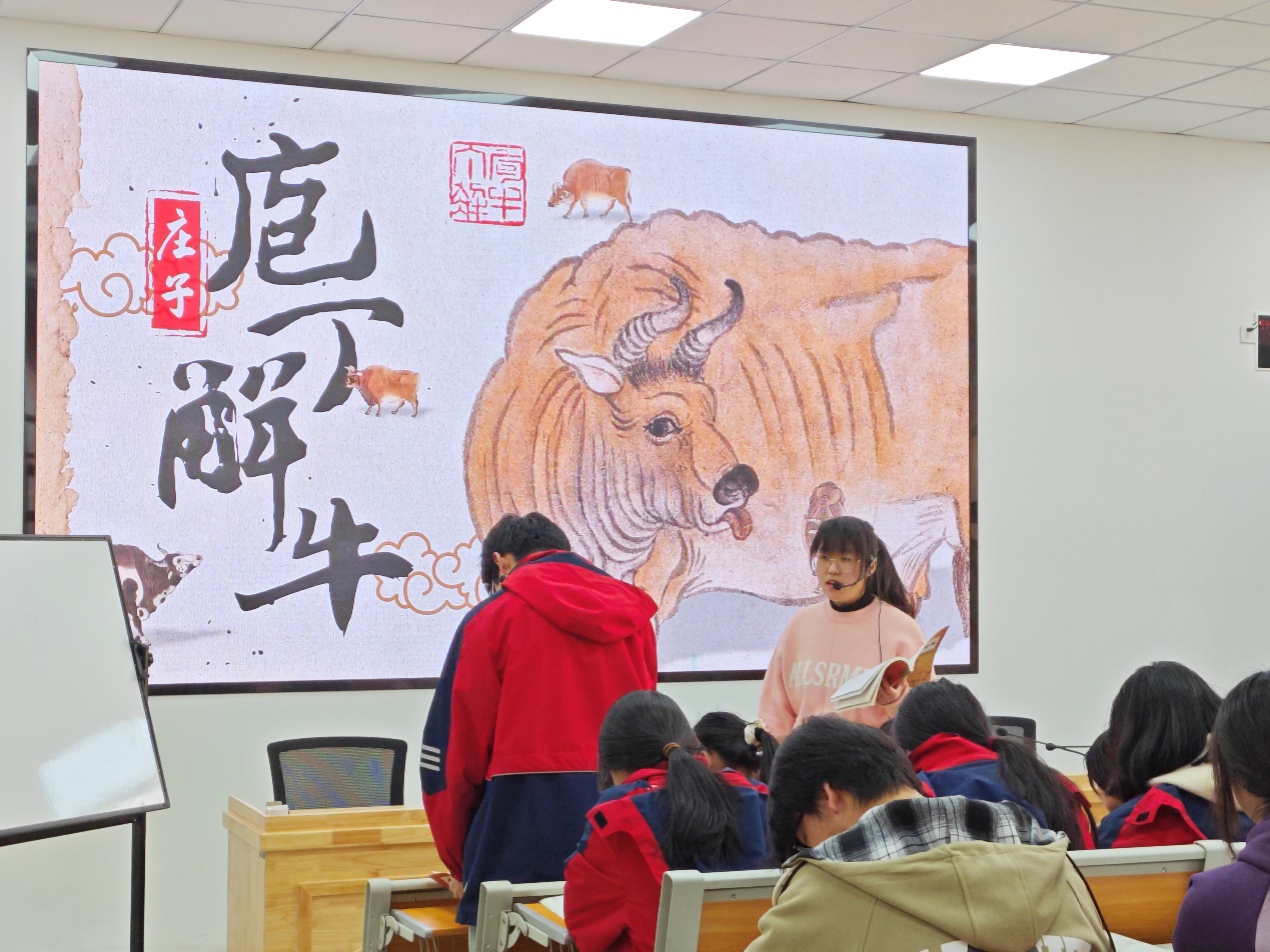 活动中,高启月老师以《庖丁解牛》为抓手向我们展示了一场精彩生动的汇报课示范课堂。高老师通过“杀牛”与“养生”的矛盾开启课堂,引发学生兴趣,依托三个学习任务步步深入,引导学生感受庄子散文之美,体味其中蕴含的深邃哲意。高老师与学生紧密互动,学生踊跃回答问题,活动现场气氛热烈。