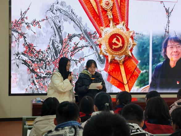 尤子吟老师以热播电影《我本是高山》导入课程,将“七一勋章”获得者张桂梅的故事贯穿整堂课,设置红“梅”颂班级主题文化展大情境,综合运用视频、图片、动图等多种素材,让学生在了解张桂梅的感人故事的过程中感初心、践初心、守初心,通过鲜活的人物形象展现中国共产党始终坚持以人民为中心,增强学生政治认同。