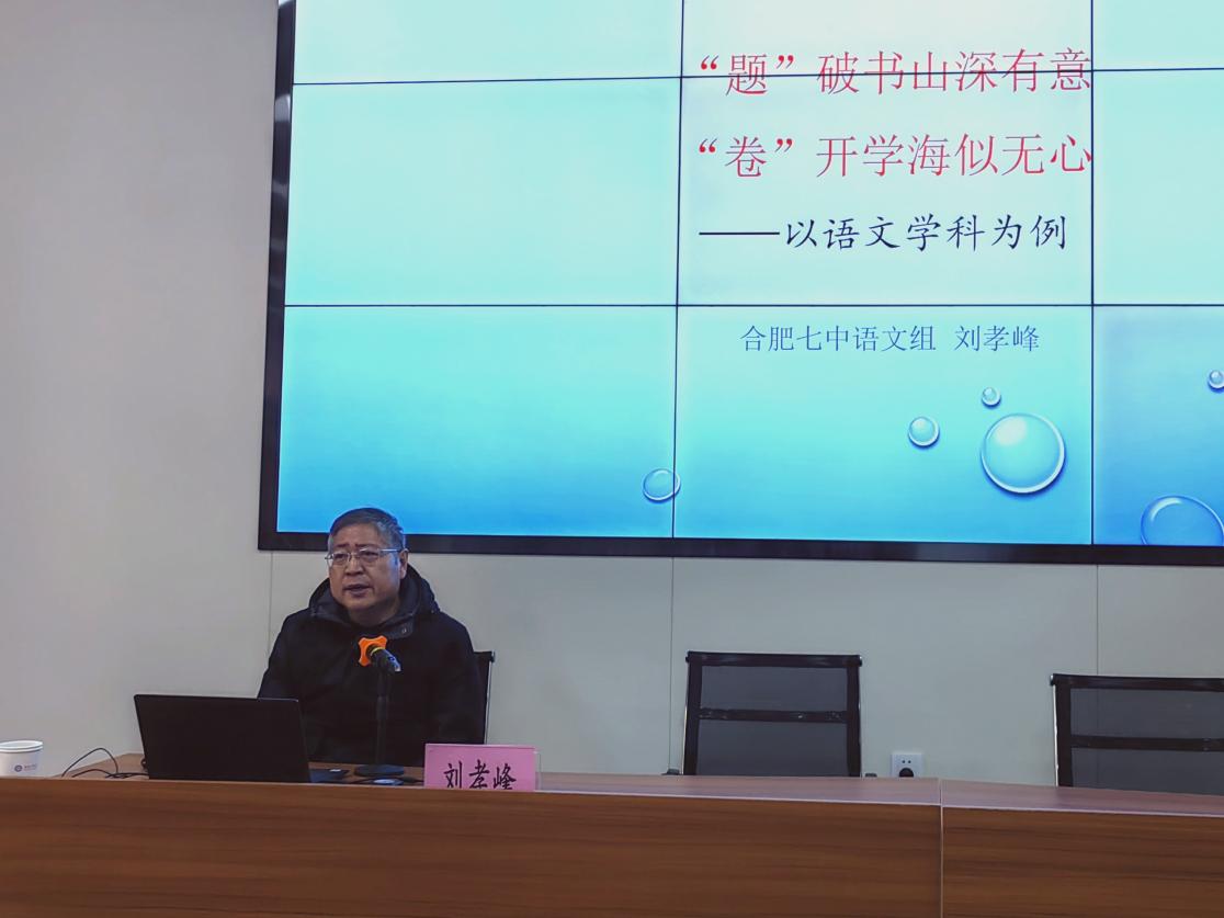 来自合肥七中语文组的刘孝峰老师首先对本次语文学科培训的命题作业进行概述,并对于试卷当中的每一部分的题型设置都提出了要求和建议。随后,刘孝峰老师就语文学科的出题组卷分享了自己的经验与心得。