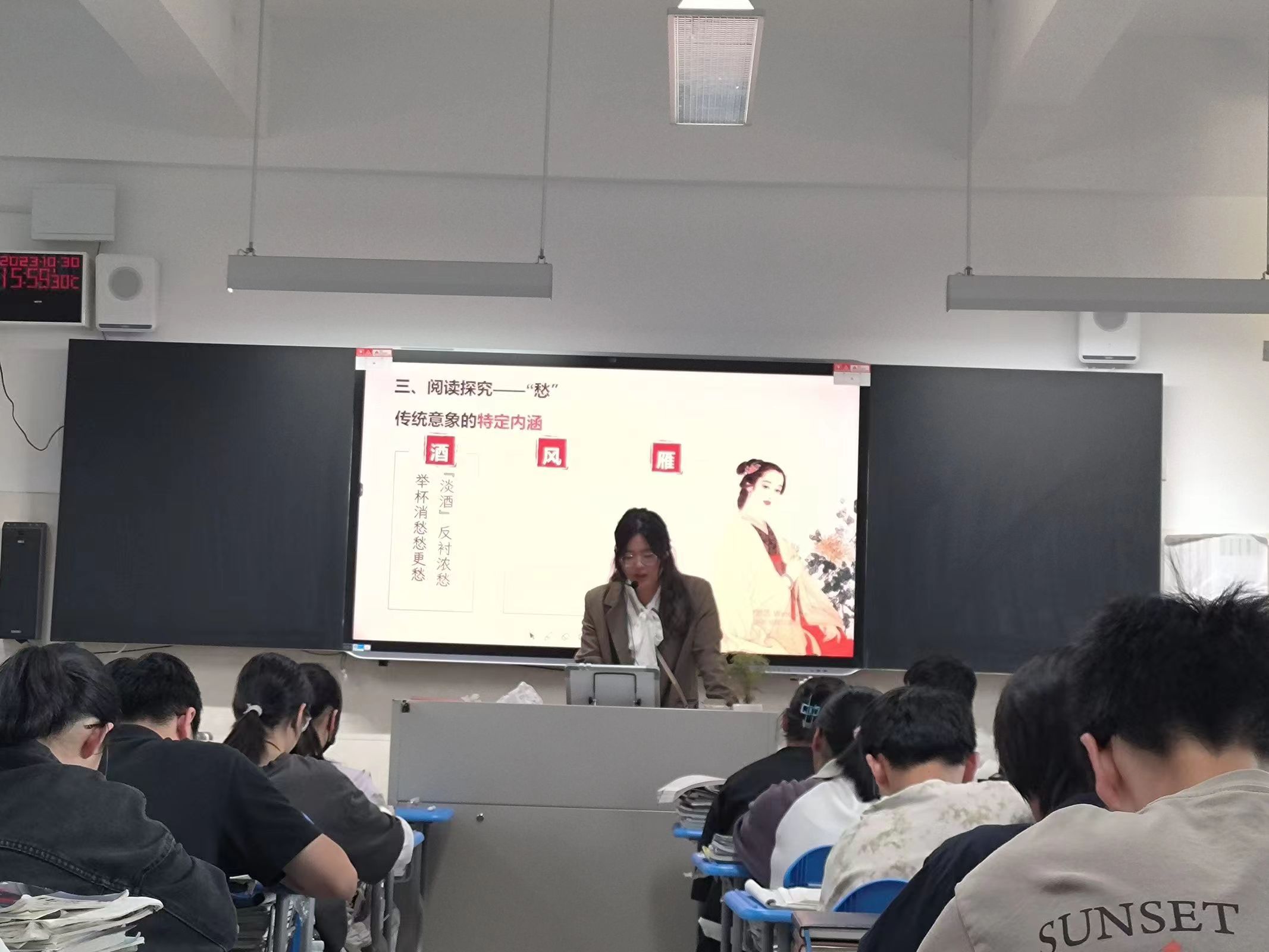 李慧老师的授课篇目是《声声慢》。李慧老师对词作本身进行了逐字逐句的详细讲解,并且抓住词中意象,在分析意象的同时让学生深入思考词人借意象抒写的“愁情”。课程最后,李老师以李清照不同时期的三首词作与课文做比较,使学生通过这些作品深刻了解词人李清照的人生经历。