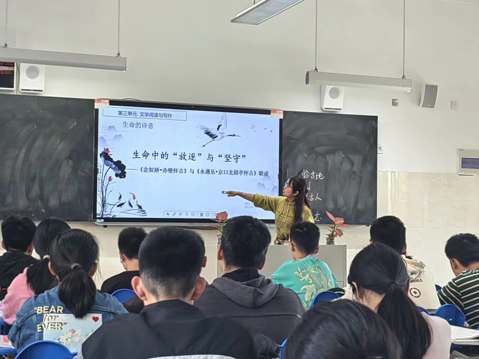 张玲老师的授课内容是《念奴娇·赤壁怀古》与《永遇乐·京口北固亭怀古》联读。张老师以“怀古之作”的常用写作结构为脉络,依靠具体的任务将两首词进行了拆分,引导学生对这些具体部分进行比较。张玲老师通过对两首词的串讲,让学生对与两位词人的生命态度有了深刻了解。