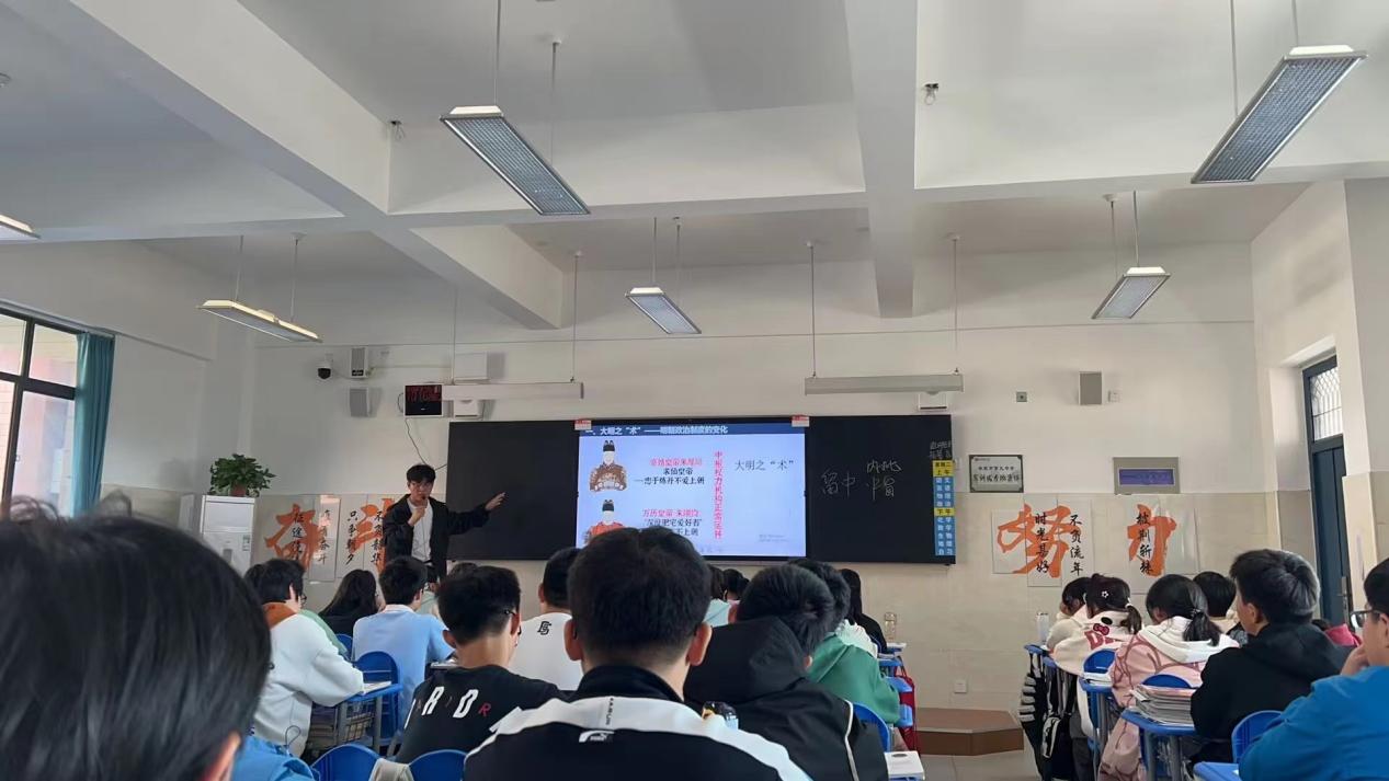 接着,青年教师翟星辰进行《从明朝建立到清军入关》的课例展示。翟星辰老师立足于大单元教学,设计层层相扣的问题链,从“明太祖为何废丞相”到“废除丞相制度的弊端”等层层深入。授课结束后,顾闻博老师对翟老师的授课表示高度赞扬。