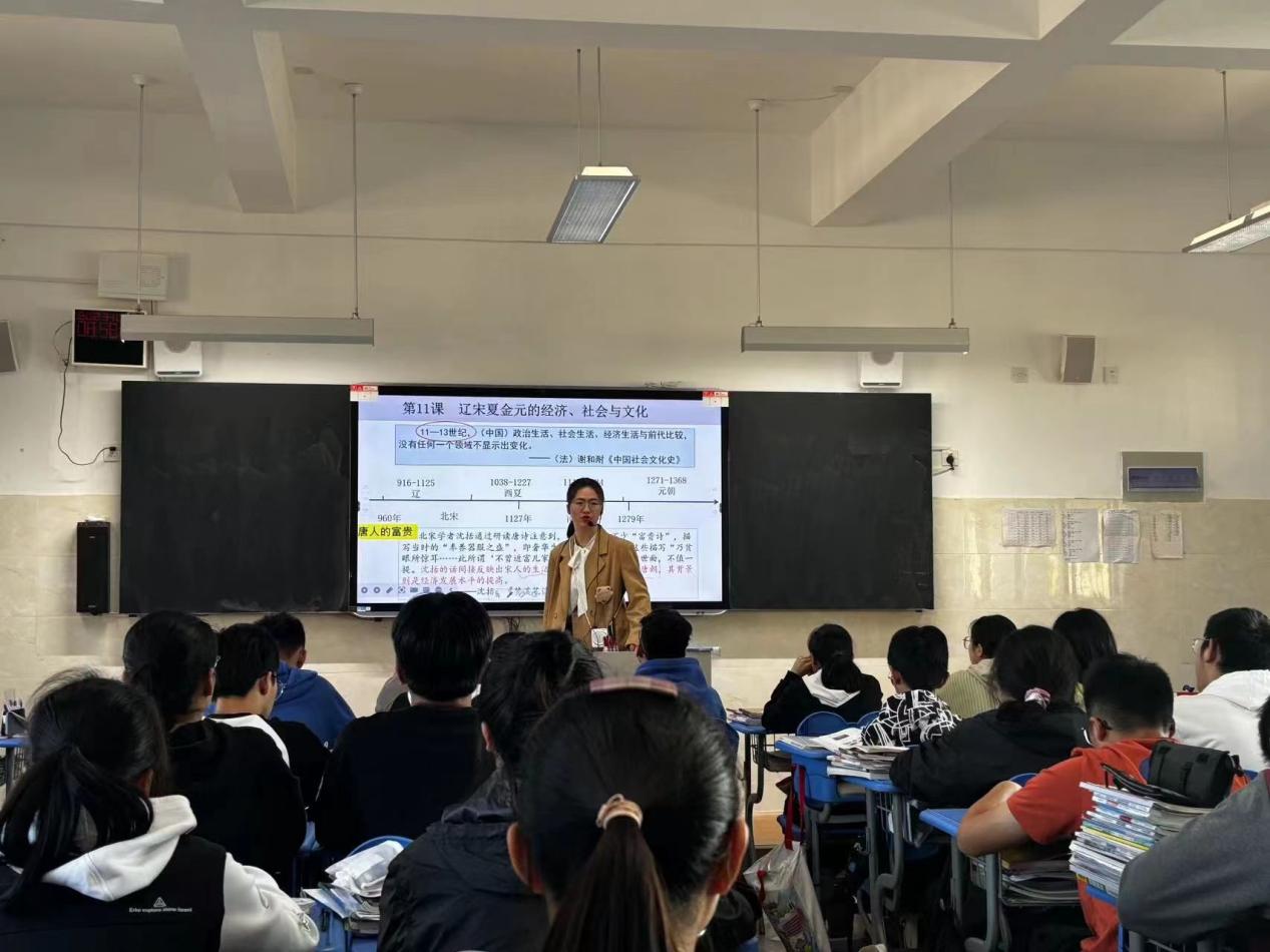 青年教师陈思莹进行《辽宋夏金元的经济、社会与文化》新授课课例展示。授课过程中,陈思莹老师关注教学难点,构建历史情境,依托情境进行深度教学。授课结束后,李媛媛老师对陈老师的新授课表示肯定,并表示需要合理规划时间,依据学情突出重难点。