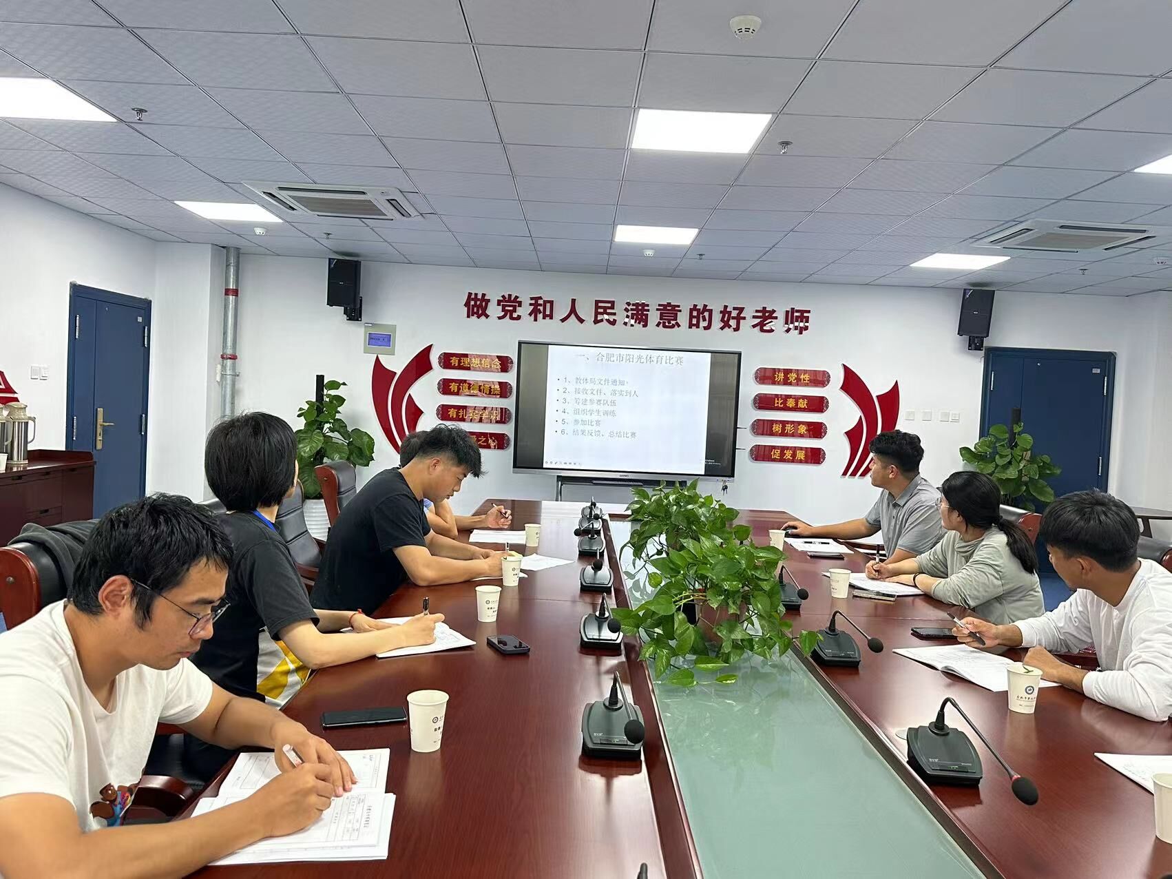 听了汇报之后,大家各抒己见,进行了交流和探讨,并达成共识:一、要在反思中成长起来,在同伴互助中共同进步,不断学习;二、深钻教材,认真教学,圆满完成任务;三、发挥特长,认知刻苦训练,办好各体育队。