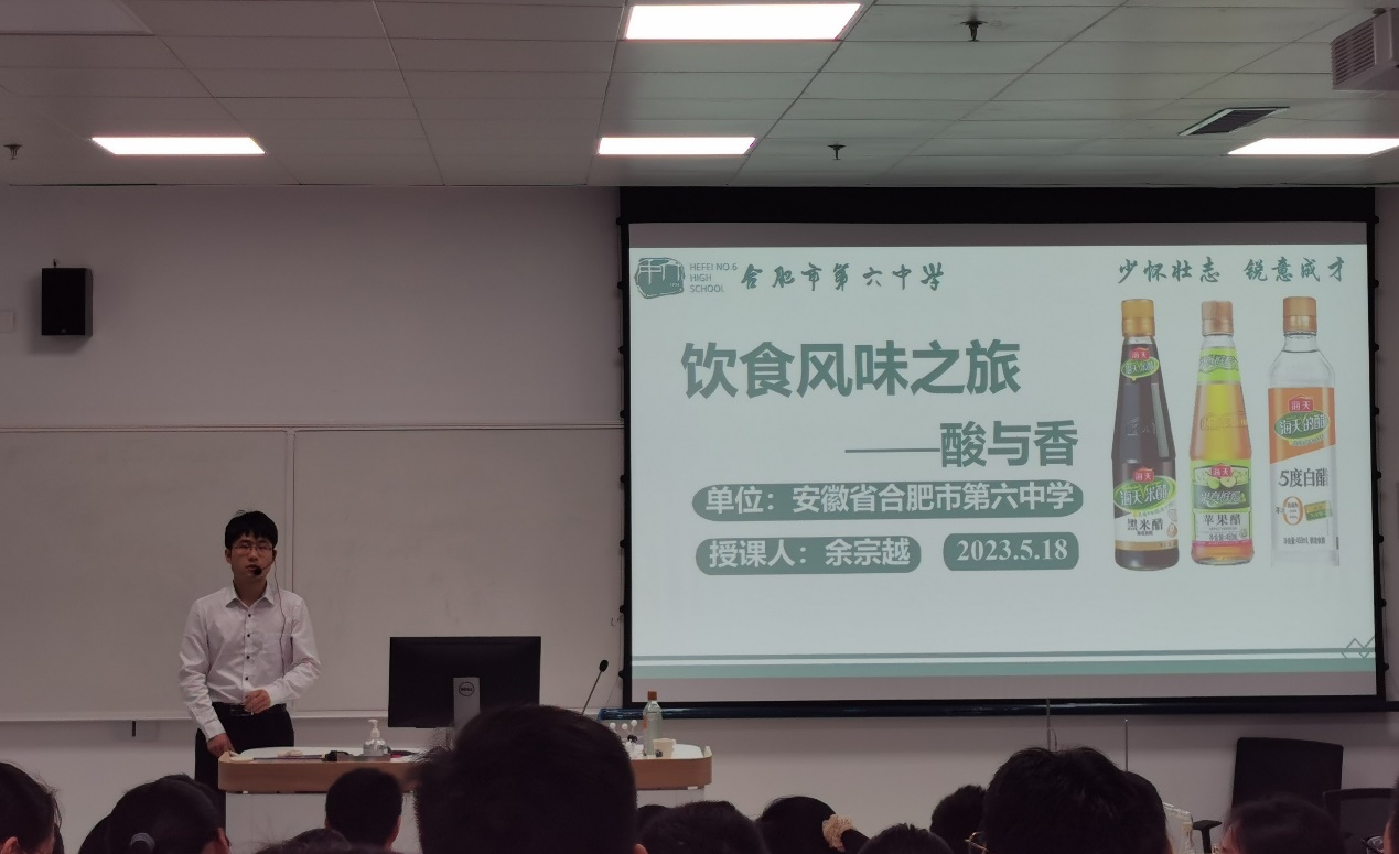 随后,合肥六中的余宗越带来第二节课《饮食风味之旅——酸与香》的展示。本节课一共分为三个环节,一是食醋风味之酸味来源,通过实验验证乙酸的酸性,引导学生从乙酸结构角度思考,为何乙酸具有酸性?发展证据推理和宏微结合的核心素养;二是食醋风味之醋香何来,利用球棍模型搭建生成的酯可能的结构,并画出结构式,从结构角度分析发生酯化反应时乙醇和乙酸如何断键,并实验模拟酿醋过程中乙酸乙酯的制备;三是食醋风味之酸香可口,分组讨论如何使得食醋风味更加丰富?最终形成认识有机物的一般思路。