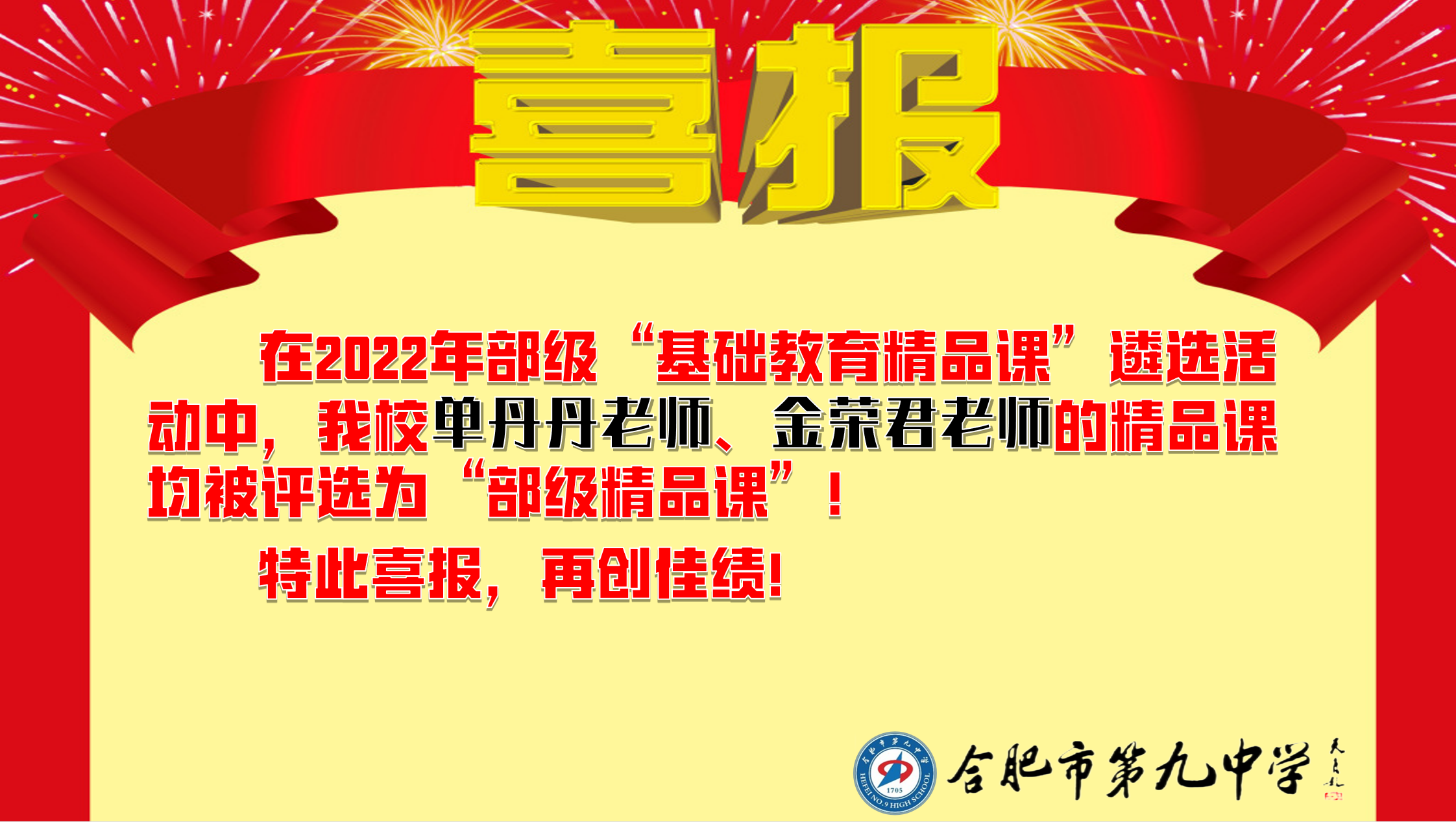 近日,教育部官网公布了2022年“基础教育精品课”遴选工作“部级精品课”的获奖名单,合肥市第九中学申报的两节精品课例均颖而出,均荣获“部级精品课”:语文组单丹丹老师执教的《咬文嚼字有深意 推敲琢磨见情味》,政治组金荣君老师执教的《坚持“两个毫不动摇”》。