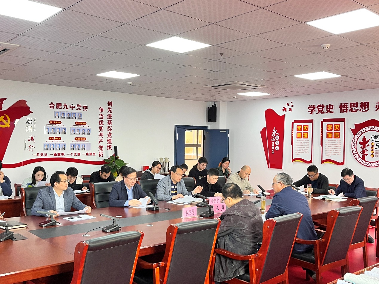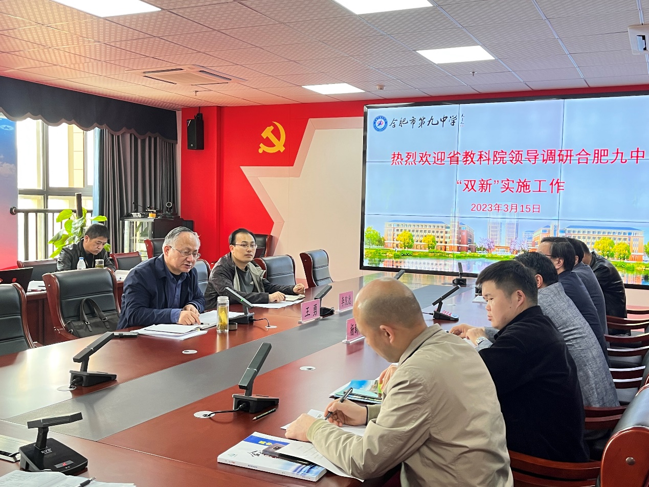 为了全面了解普通高中新课程新教材实施工作最新进展,2023年3月15日下午,安徽省教育科学研究院院长王勇、安徽省教科院数学教研员李院德莅临合肥九中调研合肥九中数学组“双新”实施工作。合肥九中党委书记、校长章伟,副校长张永剑以及高一高二全体数学老师全程参与。