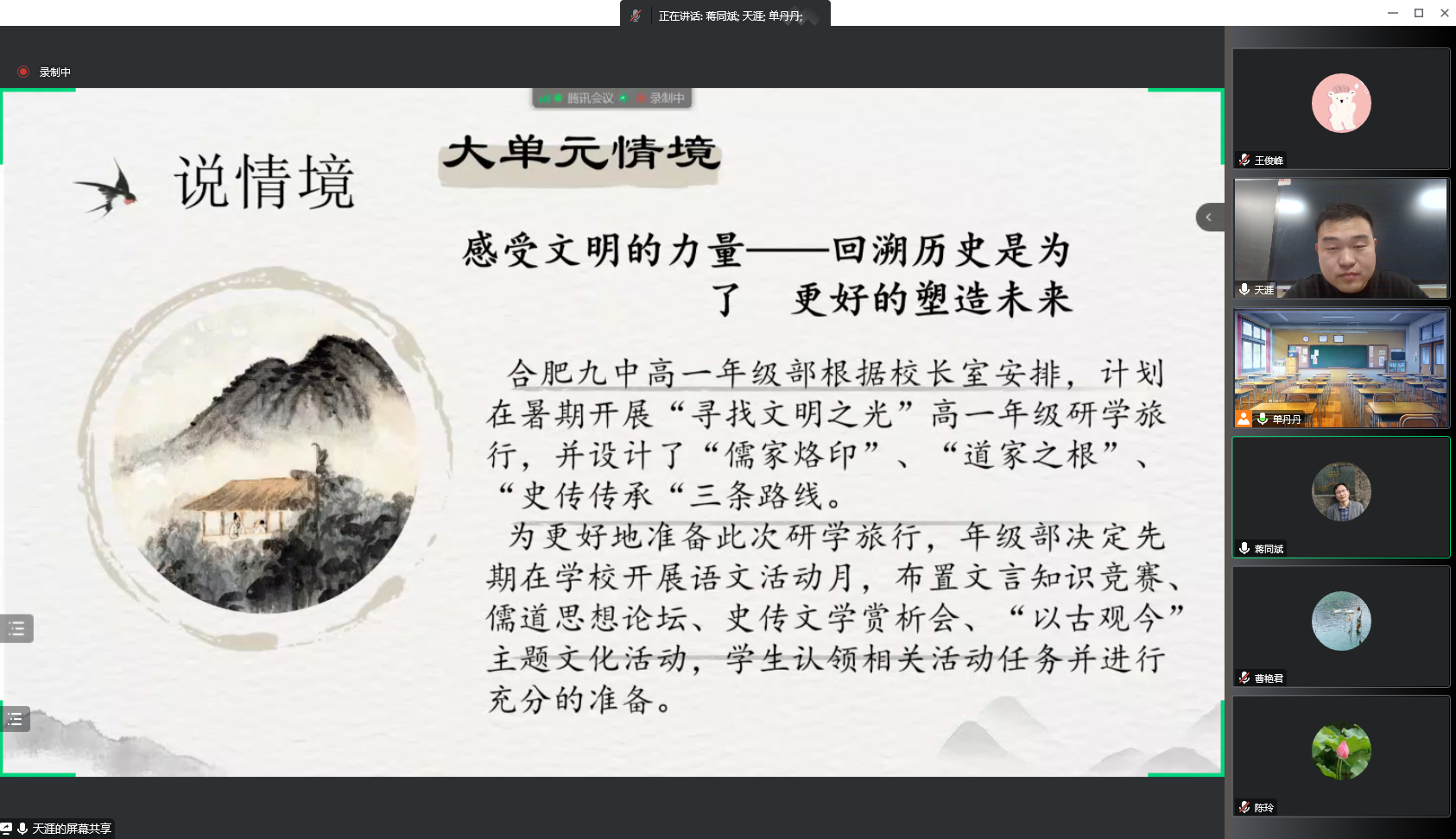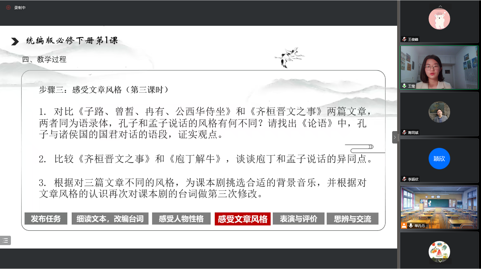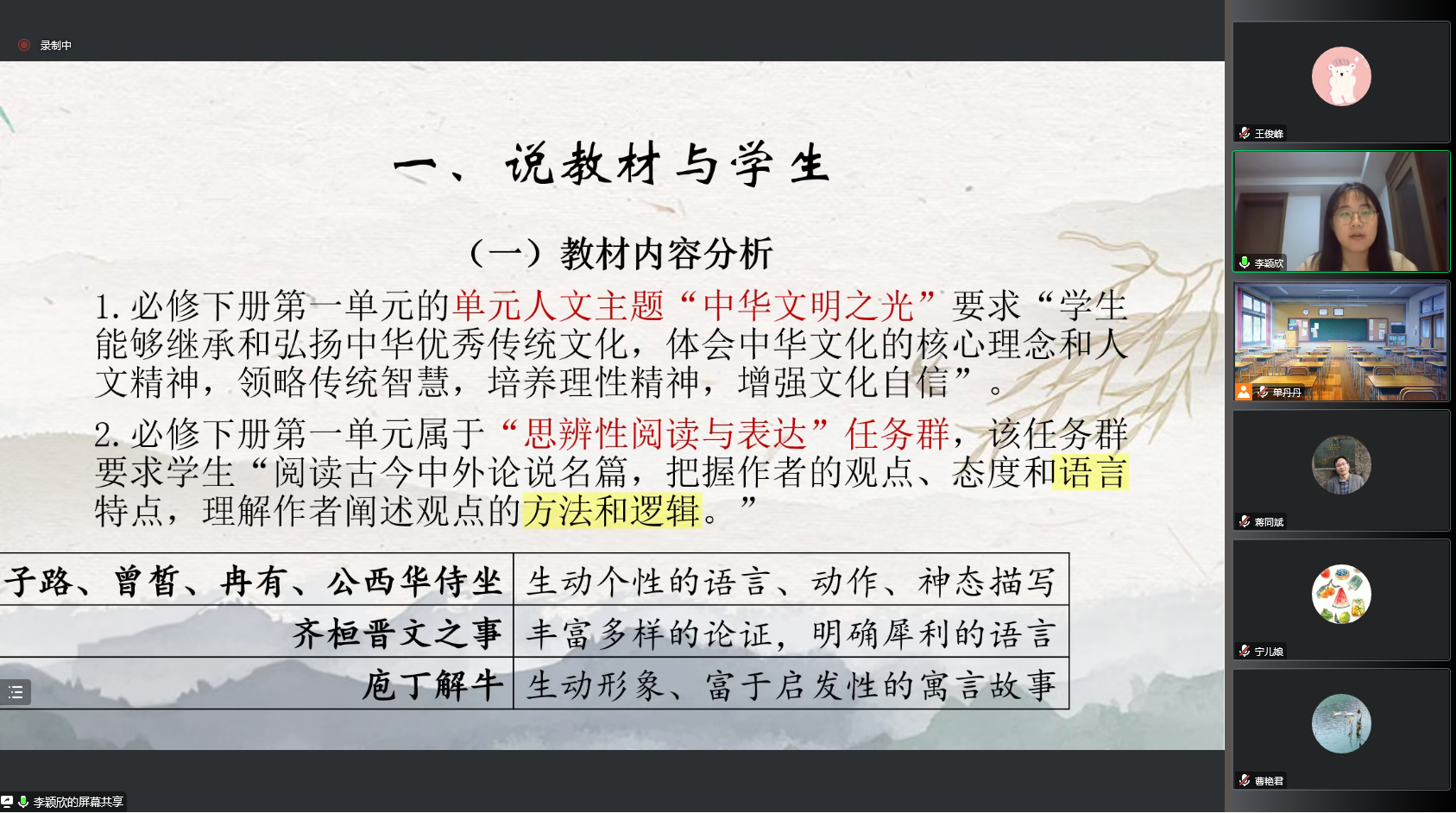 为贯彻落实教育局下发的《关于落实合肥市普通高中“双新”实施国家级示范区建设新一轮“大练兵、大比武”活动方案的通知》等文件要求,深化课堂教学改革,做好赛前准备,展现九中教师风采,合肥九中语文组积极响应,于11月11日晚八点通过腾讯会议进行了邵帅、王莹、李颖欣三位参赛老师的磨课活动。本次说课比赛的课题是统编版必修下册第一单元第一课——《子路、曾皙、冉有、公西华侍坐》、《齐桓晋文之事》和《庖丁解牛》。
