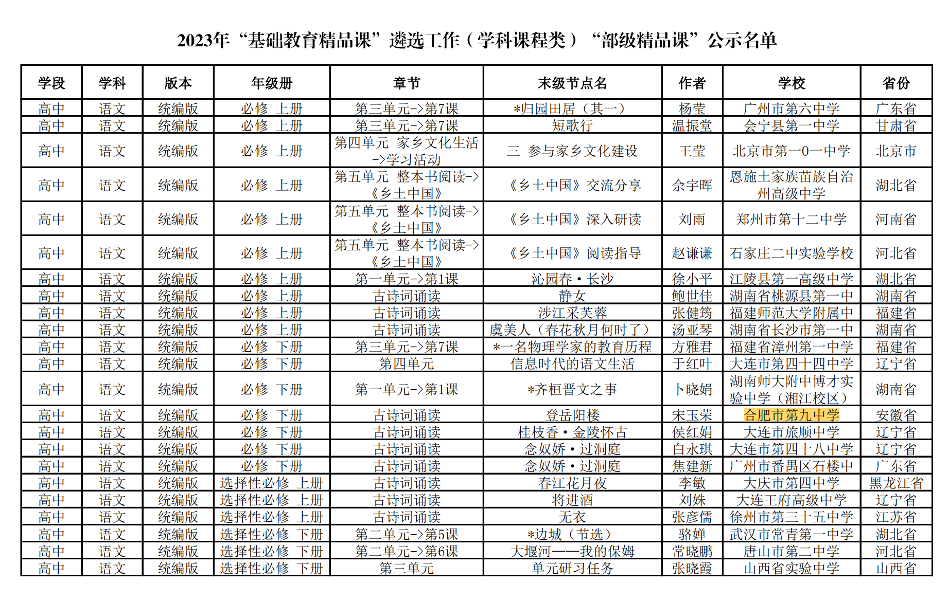 1月25日,教育部公示2023年基础教育“部级精品课”名单,合肥九中教师宋玉荣执教的课例《登岳阳楼》经过层层选拔,最终光荣入选。该课例将纳入“国家中小学智慧教育平台”优质课程资源,供全国广大师生学习使用,展现出九中优秀教师风采。