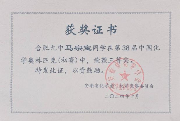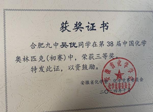 在第38届中国化学奥林匹克(初赛)中,合肥九中学子实力非凡,斩获佳绩:高三(15)班隋熠帆、高三(16)班吴优、高三(17)班马宗宝荣获省三等奖。特此向隋熠帆、吴优、马宗宝三位同学和化学组指导老师表示祝贺!