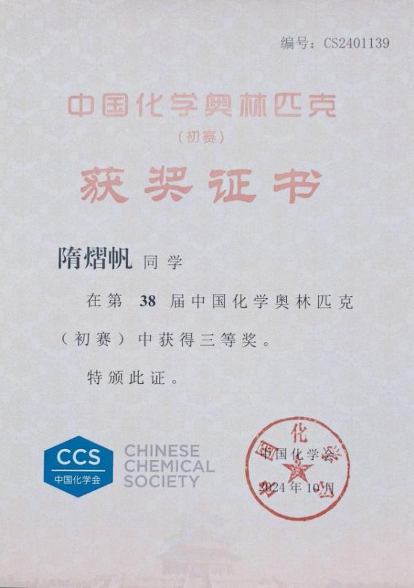 高三(15)班隋熠帆获奖后心怀感恩地说:“物质变换之间,处处彰显化学之美,化学之独特生机与活力。在化学的学习中与之结缘,切身感受到化学所带来的无穷趣味。在学习过程中需要去探索,挖掘其中的奥秘,要与所学内容心心相印,连结一心,让乐趣化为学习的助推器,引领我们在学习之路上不断前行。感谢老师们一路上辛勤的付出,没有老师辛勤的浇灌,就没有前行路的些许平静、开阔。同时也感谢同学们的支持与认可,让我能以更加积极的姿态向前行进。”