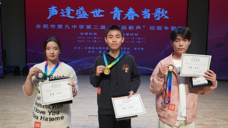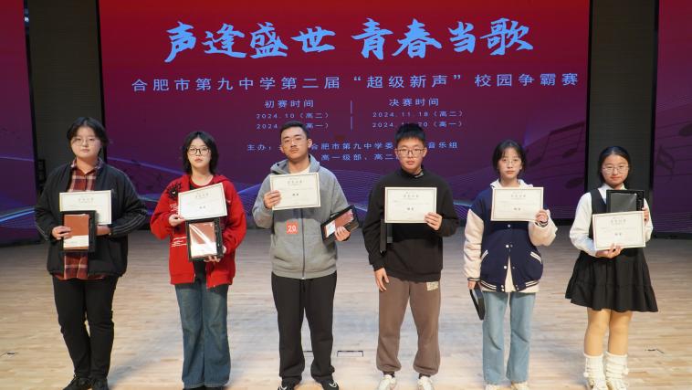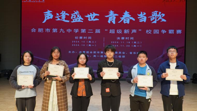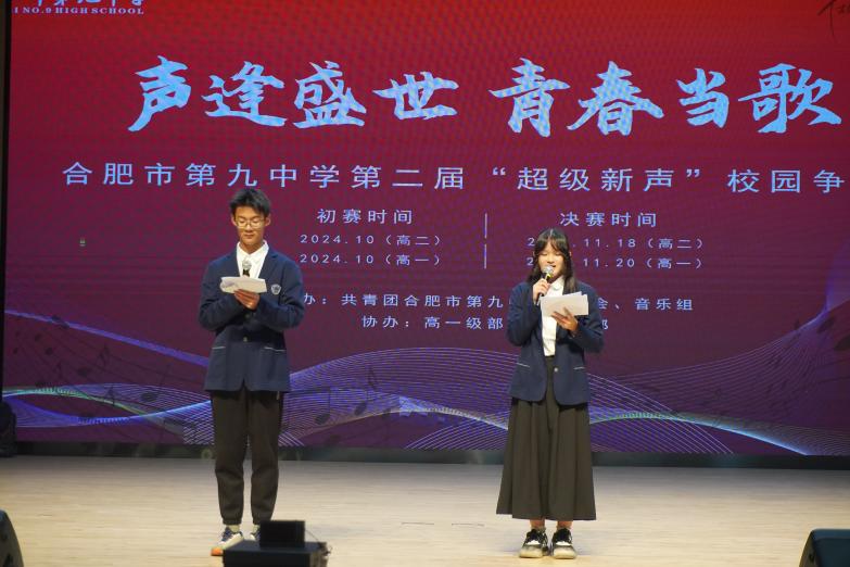 “以青春之声,燃时代之歌,展横渠风采,庆 华诞”,11月20日下午16时40分,合肥九中第二届校园歌手争霸赛(高一年级)决赛唱响庐州学堂!本次决赛邀请到音乐学科主任丁红琳,音乐教师袁雅婷、姚陆子、李菁婷,团委胡皖南老师,以及政教处徐梦琨老师担任评委,横渠之声广播站成员薛建烨、王紫睿担任主持人,高一年级全体学生观看。