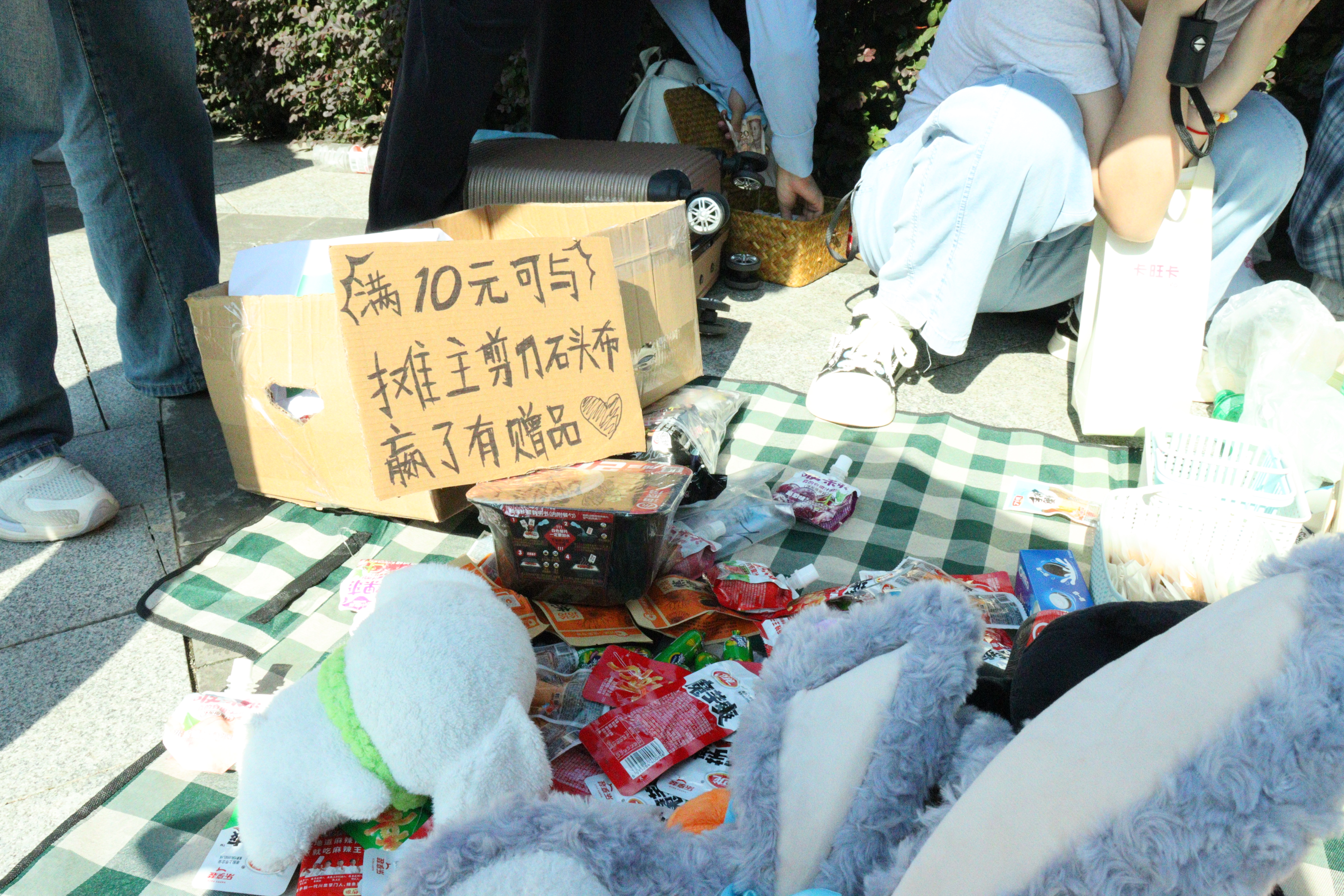 3.互动游戏集市:商贸市场不仅是一个交易活动,更是一个交流互动的平台。学生奇思妙想创设售卖摆摊形式。其中包括套圈、与店主猜拳等游戏设置,让同学们在轻松愉快的氛围中享受活动的乐趣。