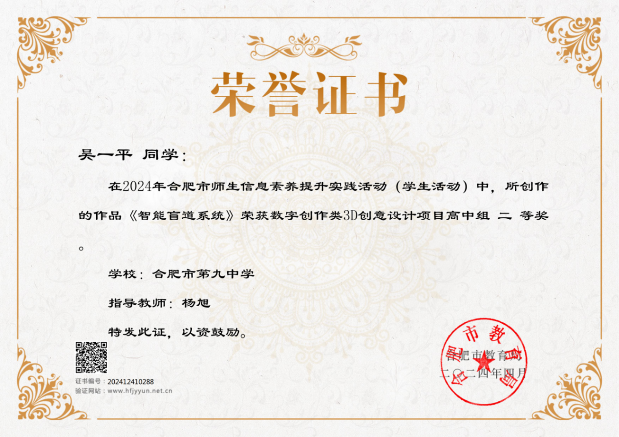 数字创作 | 3D创意设计 | 智能盲道系统 | 吴一平 | 杨旭 | 二等奖 | 是 |