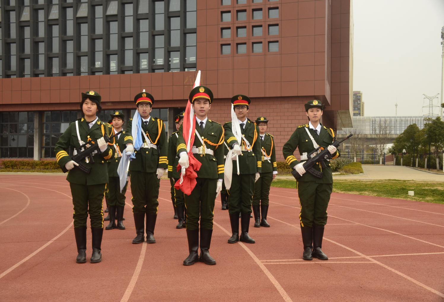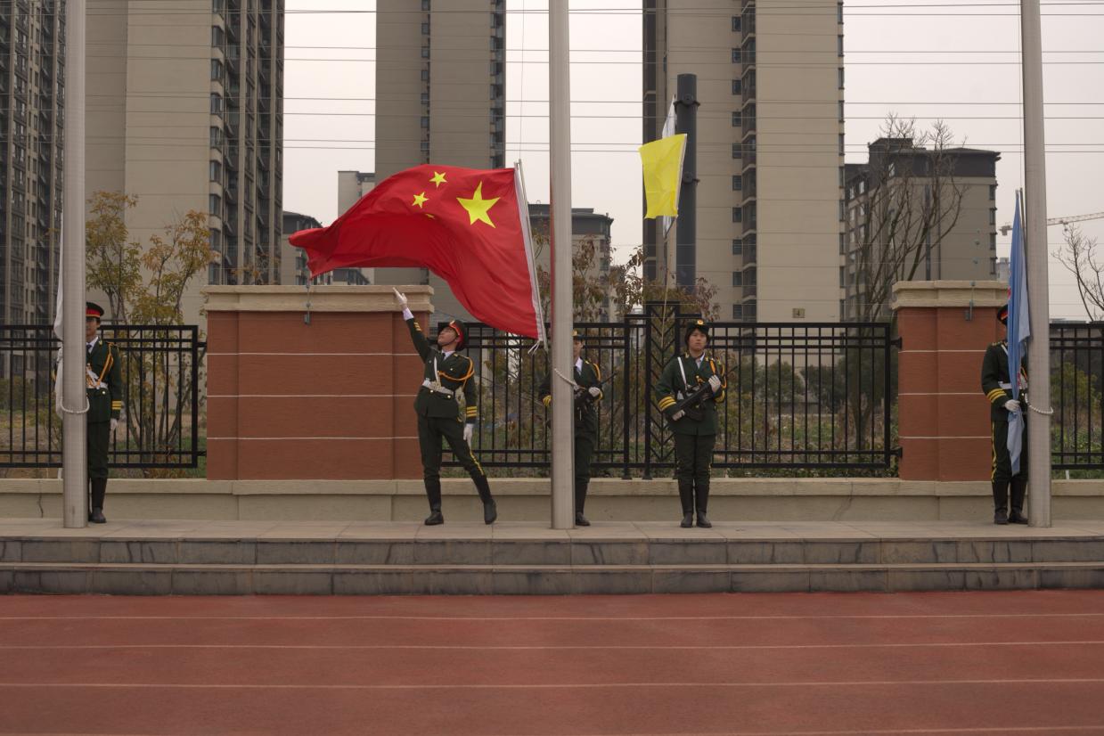 国旗护卫队英姿飒爽,迈着整齐划一的步伐护送国旗到达升旗台。在猎猎晨风与激昂的国歌声中,五星红旗冉冉升起。全体师生庄严肃立,行注目礼,爱国之情在每个人心中澎湃。
