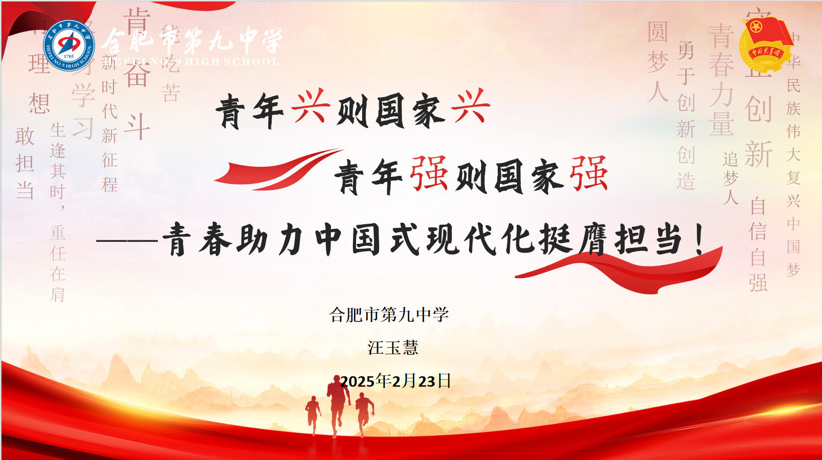 为深入学习习近平新时代中国特色社会主义思想,增强奋斗意识、厚植爱国情怀、跟随党的路线。2025年2月23日,合肥市第九中学于高一阶梯教室开展2024-2025学年春季学期团校开班仪式暨第一次团课。