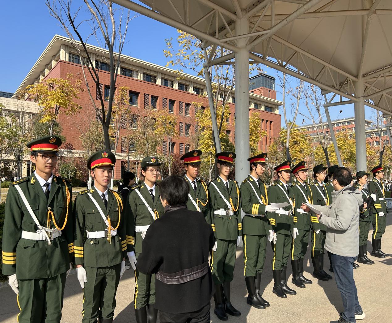 2023级国旗班首先入场,他们身姿挺拔,动作娴熟,迈着整齐的步伐,护送国旗入场,展现出了高度的专业素养和爱国情怀。从2023年10月9日开始,到2024年11月18日。2023级国旗班共执行40余次升旗任务。在入队的一年时间里,他们坚持刻苦训练,高标准、严要求,出色地完成了每一次升旗任务。