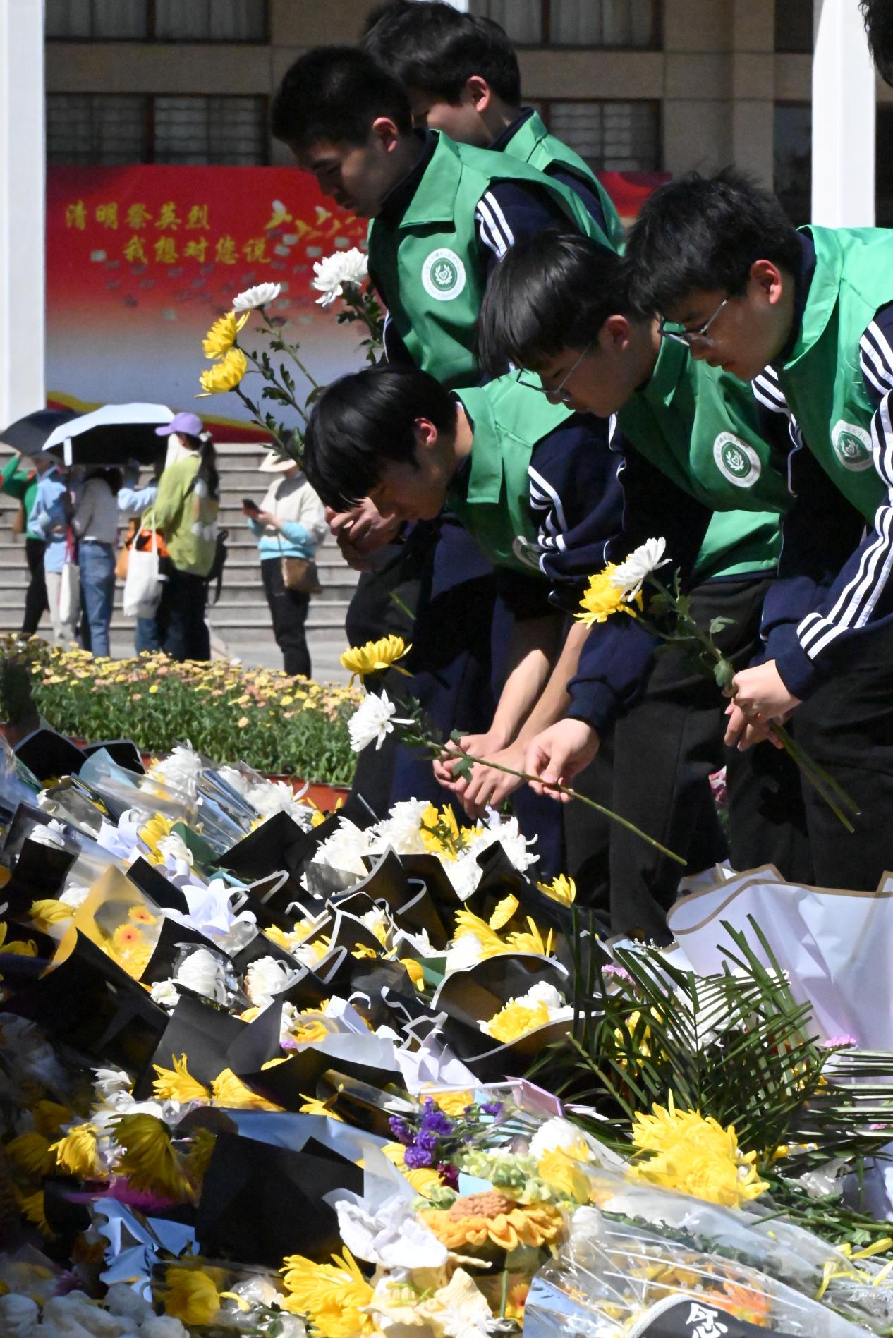 志愿者们走进陵园后,手持菊花,来到放满了来自市民敬赠菊花的石碑前,全体肃立,深鞠三躬,之后敬赠菊花。