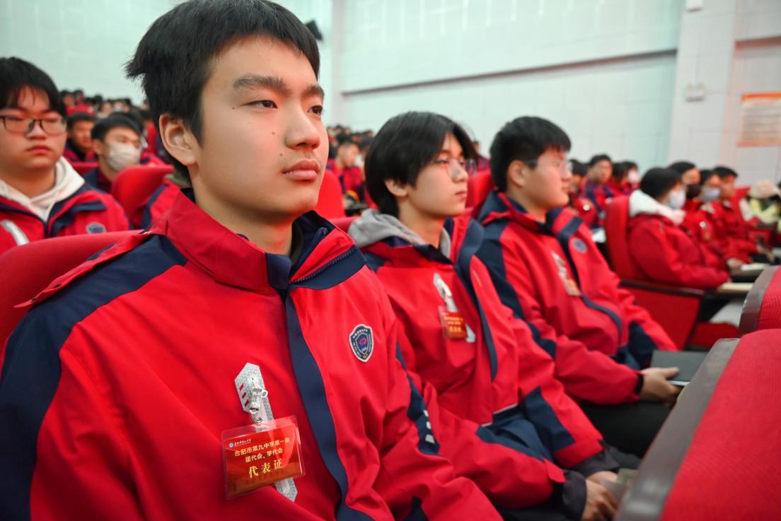 青春正逢盛世,奋斗恰如其时。为深入学习贯彻习近平新时代中国特色社会主义思想,贯彻党的二十大精神,发扬九中同学参与学校建设的主人翁精神。2024年1月17日合肥九中校团委在校党委校长室的指导下,组织召开了第一届团代会、学代会,校党委书记章伟、校党委副书记、校长张永剑、校党委委员、副校长许祖国、范玮以及学校德育部门中层干部出席会议。大会由学生代表高二2班徐子妍同学主持。