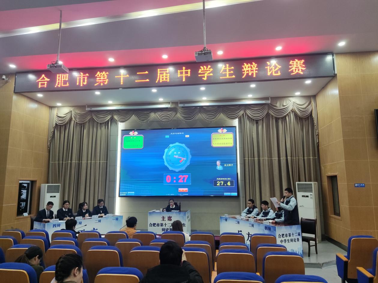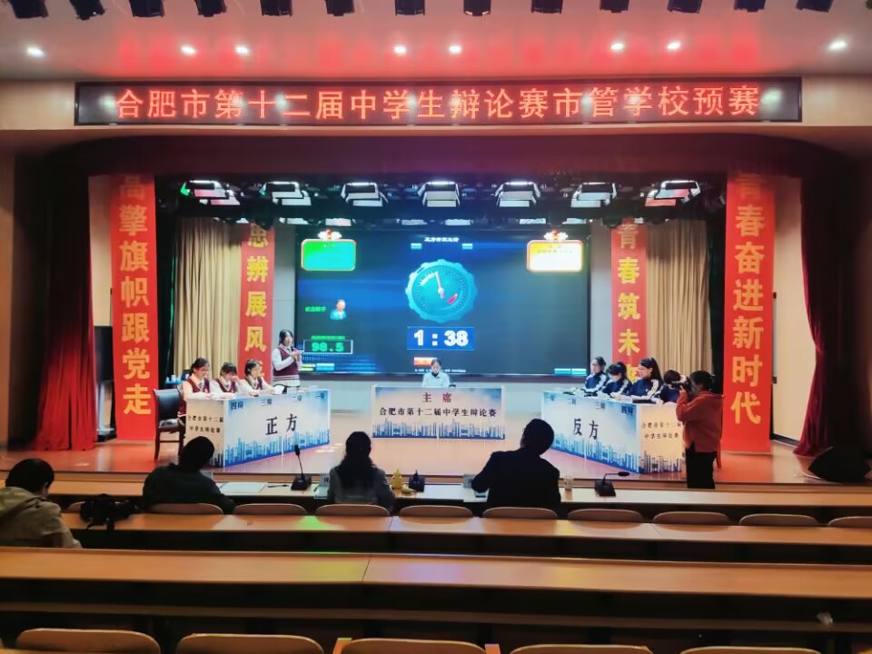 在合肥市中学生辩论赛的赛场上,也有合肥九中辩论社的身影。初赛中,读书宜博还是宜精?社内的四个辩手从“心”而论,据理力争,以理服人,辩出了九中人的风采,取得了本场比赛的胜利,成功进入决赛。决赛中,人生更应该追求不凡还是平凡?九中学子引经据典,字字珠玑,虽然所持观点客观上不占优势,但仍然击败了对方队伍,并且将本场比赛最佳辩手收获囊中,最终获得了合肥市中学生辩论赛三等奖。