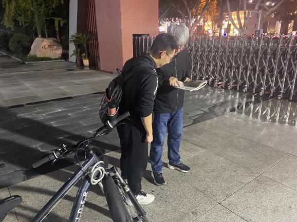 夕阳西下,大部分老师、同学都踏上了回家的路,求知若渴的九中学子把老师“拦”在了校门口,老师带着孩子骑在自行车上仍在为学生耐心解答。