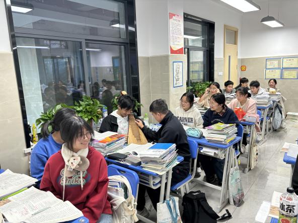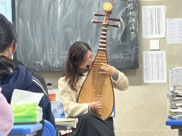 在教授《琵琶行》这一课时,张恺婧老师打破了传统的教学模式,将自己的兴趣特长“琵琶”带到了教室里。课堂上,她不仅为同学们详细讲解了诗歌的内容,还亲自示范了“轻拢慢捻抹复挑”的琵琶指法,并弹奏了一段琵琶名曲,教室里回荡着琵琶的美妙乐音,同学们仿佛置身于诗歌中的场景,深刻体会到了“大珠小珠落玉盘”之妙。