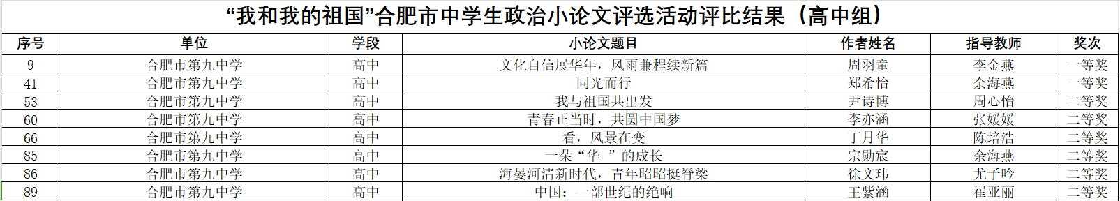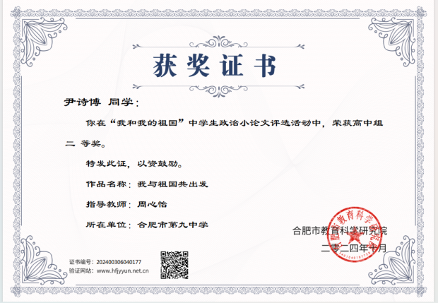 荣获二等奖的6位同学,他们的论文同样主题突出、论述深入,既有对新中国辉煌成就的深情回顾,也有对祖国美好未来的展望。获奖同学的精彩文章,展现了合肥九中学生们在政治学习和文章写作方面的扎实功底和创新能力。