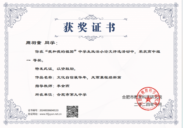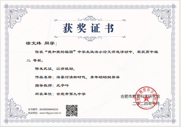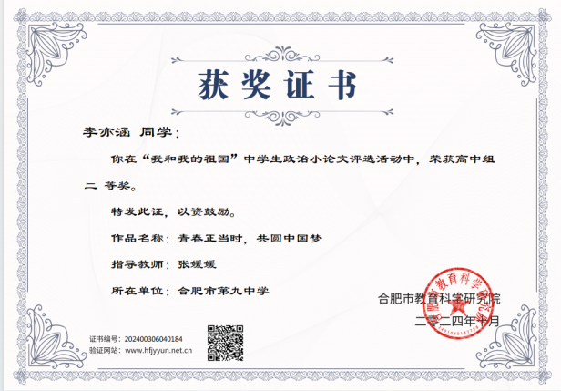 在评选活动中,合肥九中的学生们以饱满的热情和深刻地思考,撰写了一篇篇充满爱国情怀和时代气息的政治小论文。经过专家评审,周羽童、郑希怡两位同学荣获一等奖;尹诗博、李亦涵、丁月华、宗勋宸、徐文玮、王紫涵等6位同学荣获二等奖。