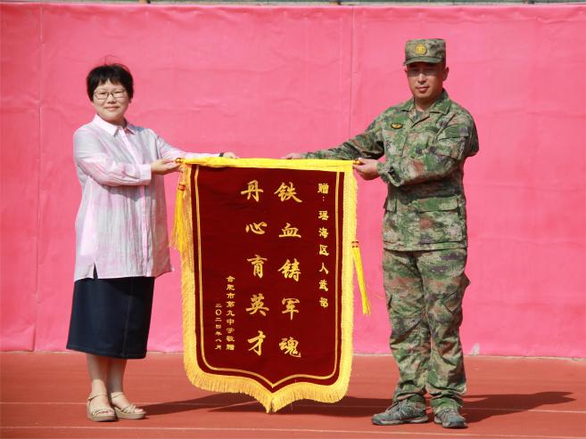瑶海区人武部对合肥九中军训工作的开展提供了大力支持,为表达谢意,汪玉慧代表合肥九中向瑶海区人武部赠送了锦旗。这面旗帜,不仅承载着学校对瑶海区人武部长期以来支持学校国防教育和军训工作的深深感激,更象征着军地共建、军民融合的美好愿景,以及对未来国防事业的共同期许。
