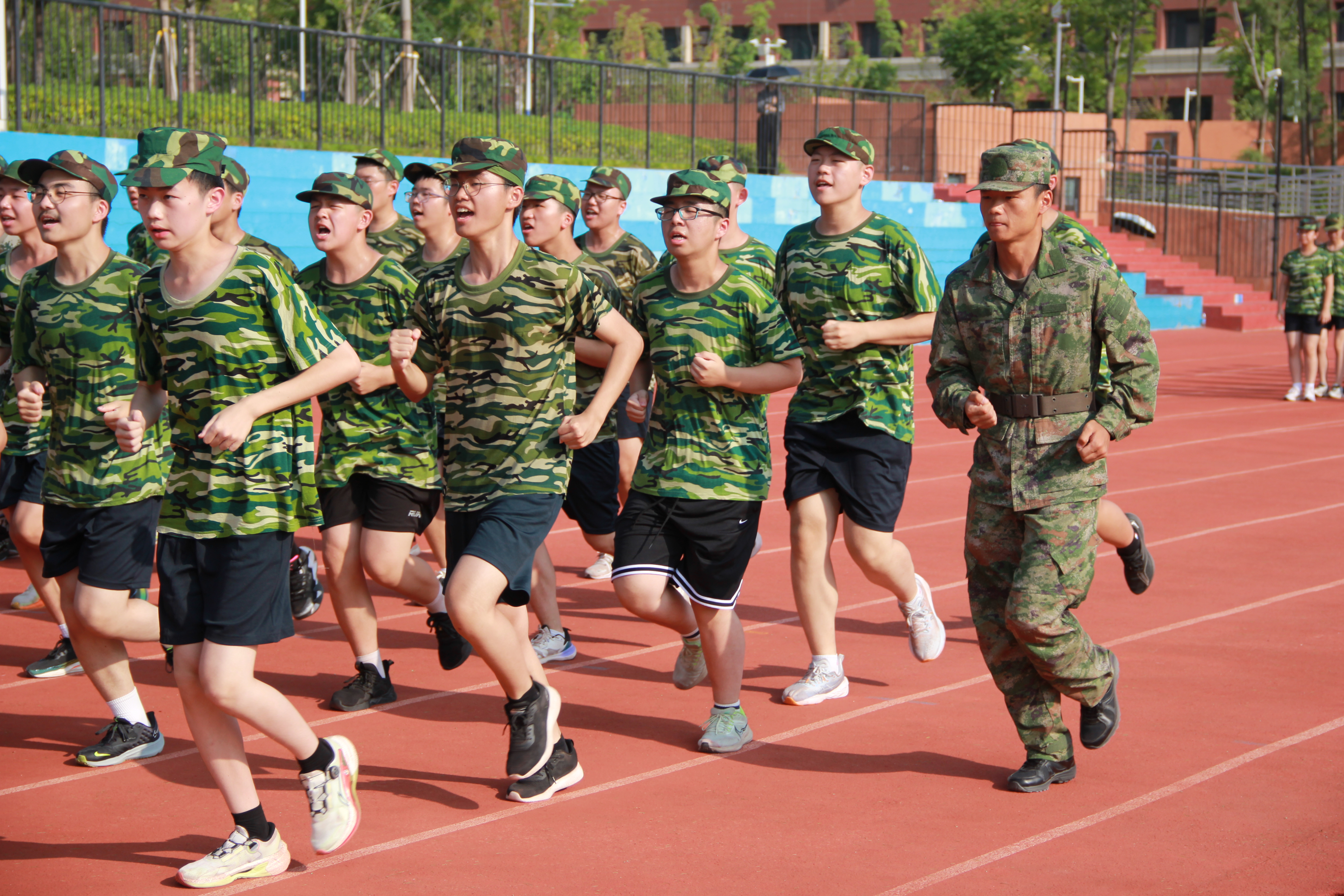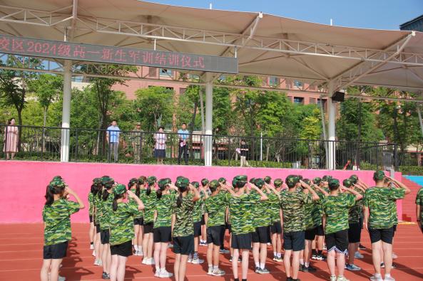 最后全体同学合唱《强军战歌》,在同学们嘹亮的军歌声中,范玮宣布合肥九中2024级高一新生军训圆满结训!