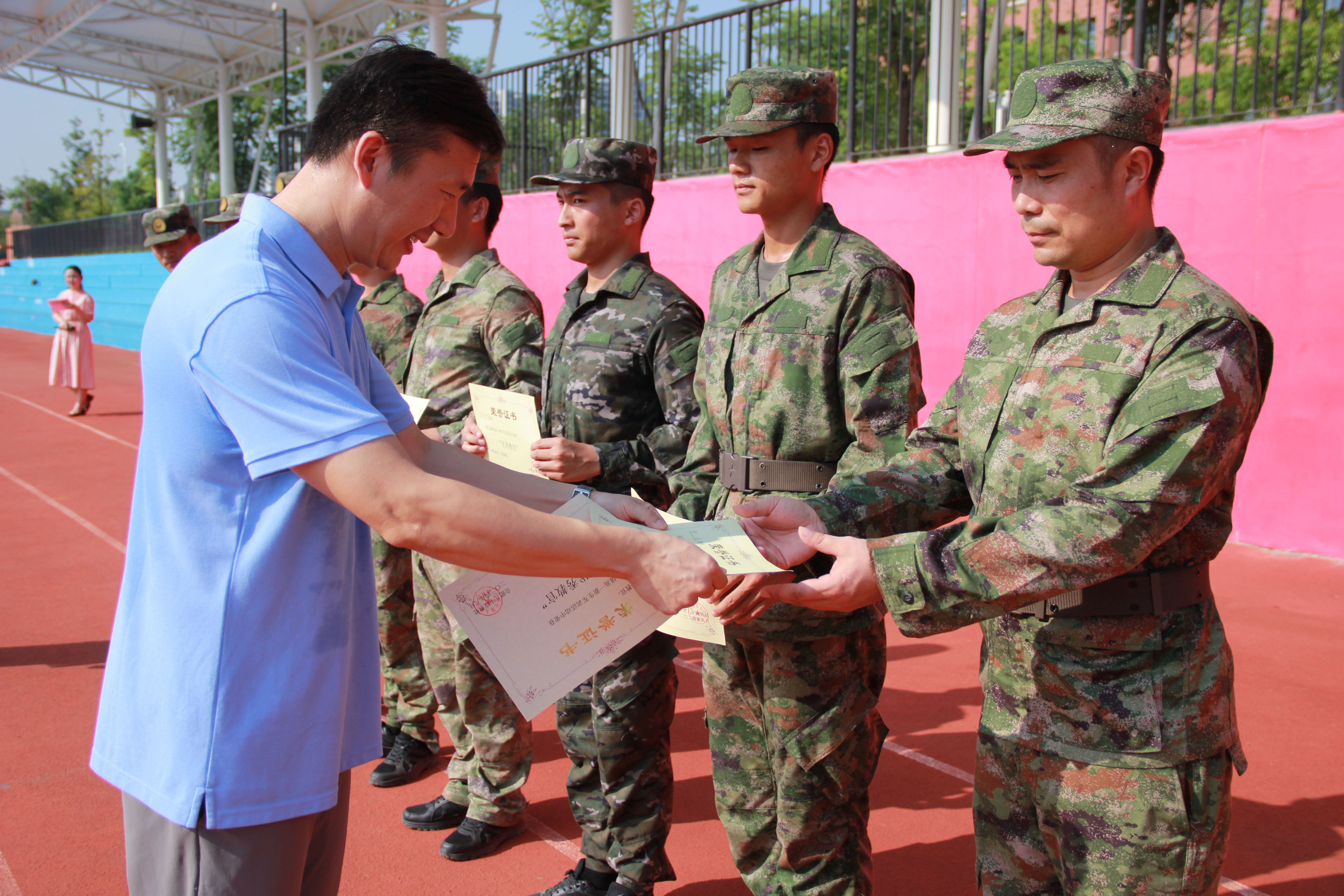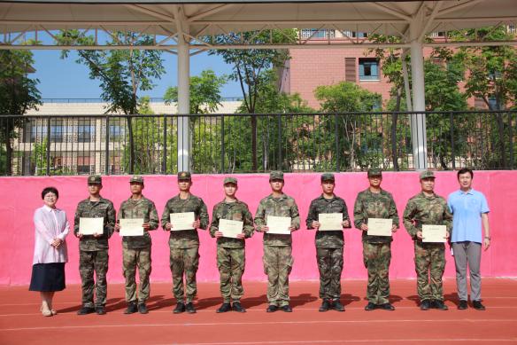 汇演结束后,仪式进入表彰优秀环节,高一年级部德育主任邵帅宣读“内务优秀寝室”名单,周福远宣读“军训优秀学员”名单,马亚亮宣读“军训优秀教官”名单,范玮宣读“军训优秀班集体”名单。校领导共同为获奖代表颁发证书并合影留念。