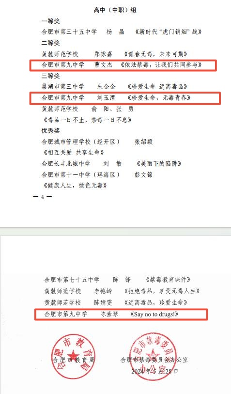 近日,合肥市禁毒委员会办公室、合肥市教育局联合举办的全市中小学毒品预防教育课件大赛活动结果揭晓,合肥九中在此项活动中荣获佳绩,曹文杰老师的作品《依法禁毒,让我们共同参与》获得二等奖、刘玉谭老师的作品《珍爱生命,无毒青春》获得三等奖、陈素琴老师的作品《Say no to drugs!》获得优秀奖,获奖数量和质量都位居市属高中首位!
