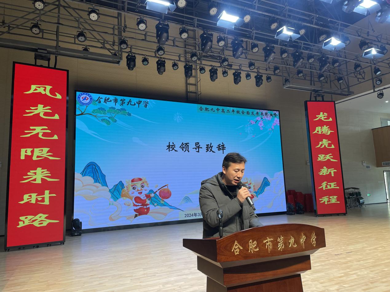 范玮作大会致辞。他为所有获奖学生感到高兴,认为这是学生努力的最好回报,也是对九中精神的生动诠释;他也为所有高二学子送去祝福与期待,希望全体高二学子能够“乘风破浪会有时,直挂云帆济沧海”,在新的学期创造新的辉煌,登上更广阔的舞台。
