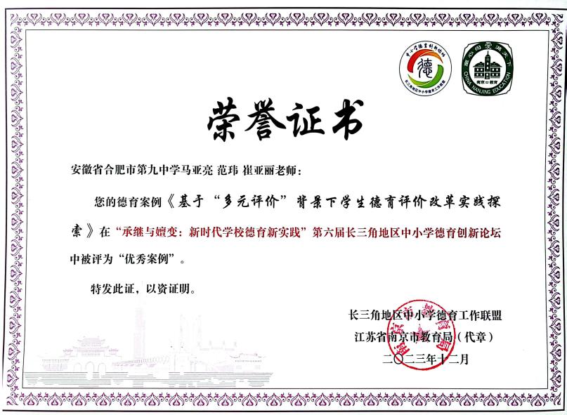 为深入贯彻党的二十大精神,持续推动落实立德树人根本任务,形成“携手同行、顶层设计、典型示范、重点突破”的长三角中小学德育工作合作新局面,12月11日-12日,第六届长三角地区中小学德育创新论坛在江苏南京举行。合肥九中作为本届论坛“优秀案例”的获评单位受邀参会,校党委委员、副校长范玮和政教处主任马亚亮组成的德育团队在合肥市教育局的带队下赴宁学习交流德育新实践。