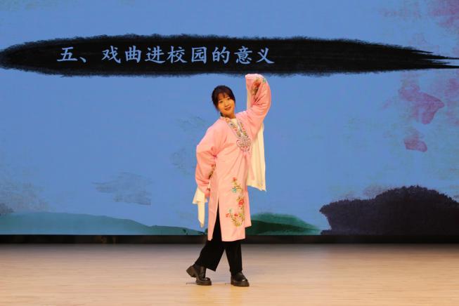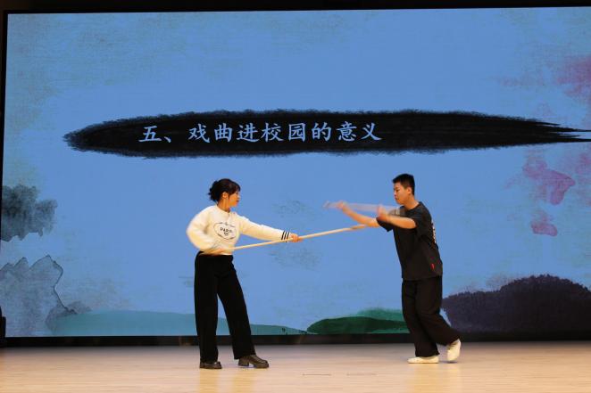 最后的现场互动教学,更是掀起了本次活动的高潮。挺拔的身姿,昂扬的气势,飞转的花枪,飞舞的水袖,引来同学们争相上台体验学习,刘老师手把手耐心地现场教授,同学们认真投入地倾听、展示,台下同学目不转睛地欣赏体会,不由自主跟着模仿。这些无不展示着戏曲文化的独特魅力。中华传统戏曲文化的种子在同学们心中悄然生根发芽。