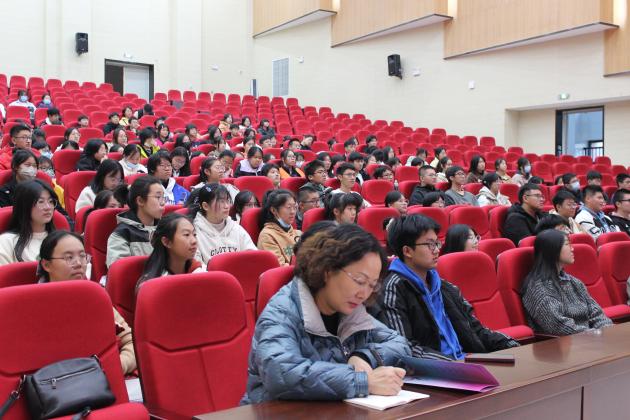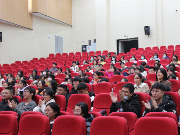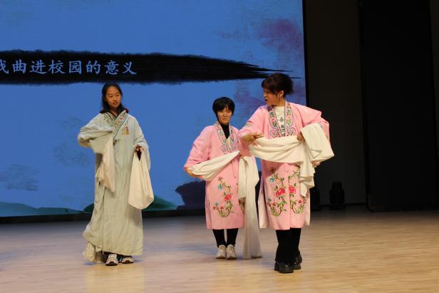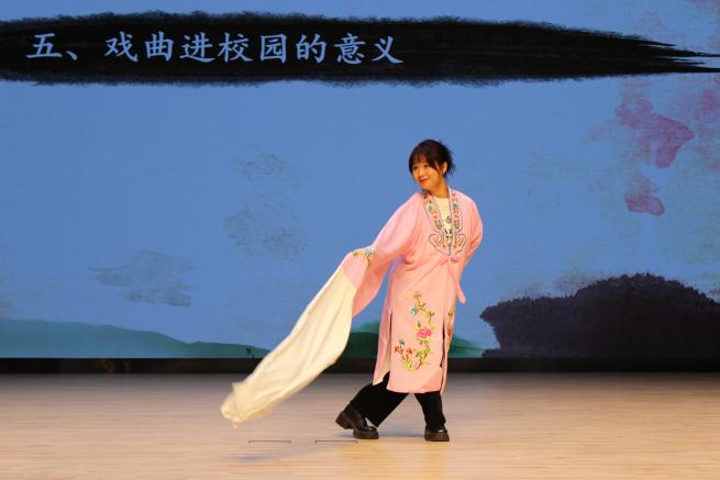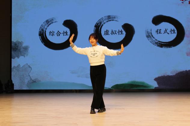 伴随着丁山教授的理论讲解,刘思婷老师和两位戏曲专业同学演唱了京剧、黄梅戏的经典唱段,为同学们示范了戏曲的基本动作兰花指、兰花掌、兰花拳、水袖功等,台上老师表演得精彩绝伦,台下同学们模仿得惟妙惟肖,师生欢聚一堂,戏曲文化在这里传承。