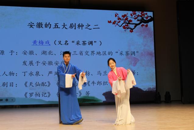 丁山从理论和实践两个维度给同学们介绍戏曲基础知识。他首先介绍了戏曲的社会功能和艺术特征,然后细致讲解了安徽戏曲五大剧种各自的来源、代表人物、代表剧目等,并通过视频和助演嘉宾的表演让学生直观感受各剧种的特征。戏曲的行当以及“四功五法”的详细介绍和展示让同学们频频拍手称赞,感叹中华传统戏曲艺术的独特魅力。
