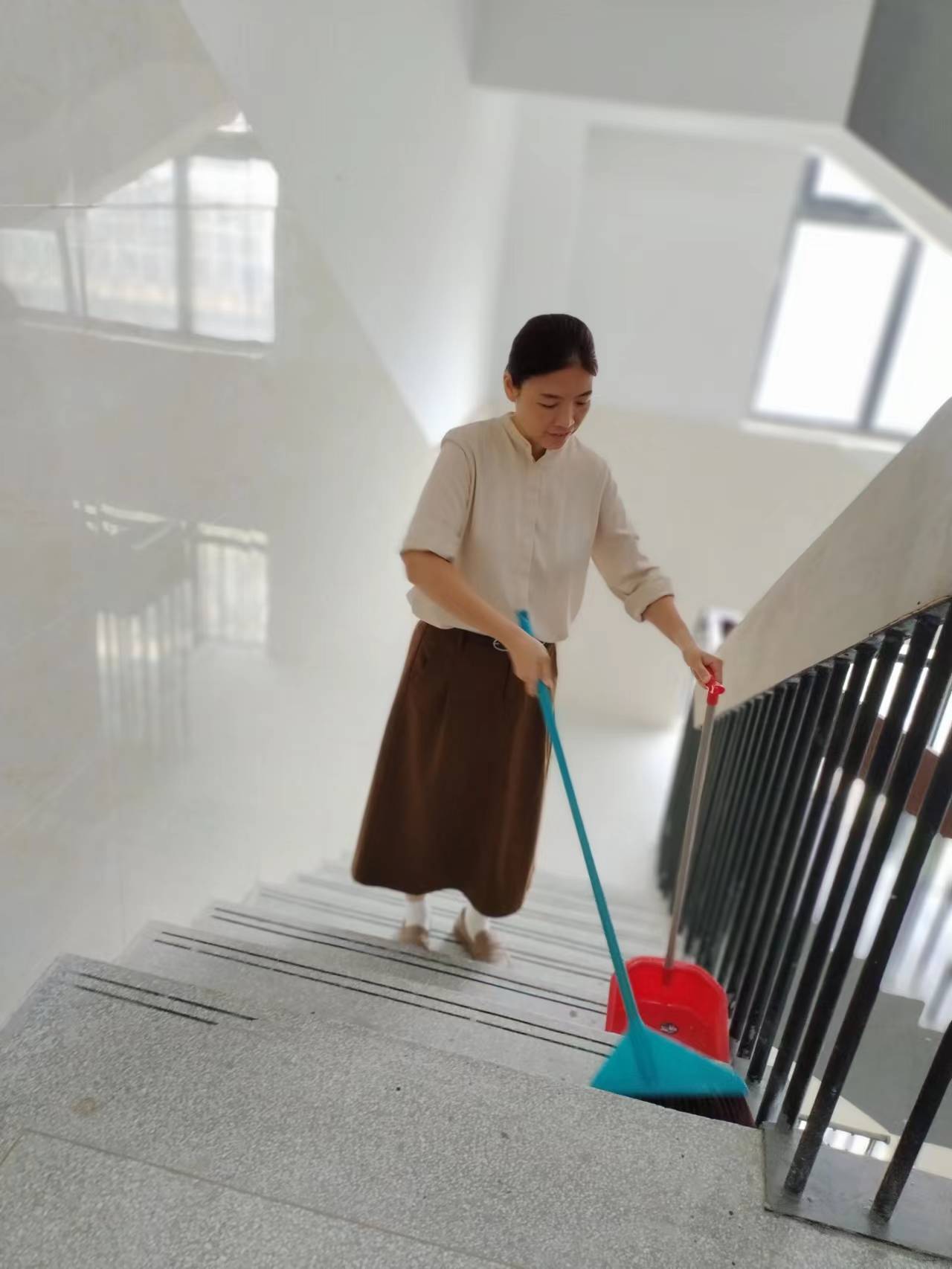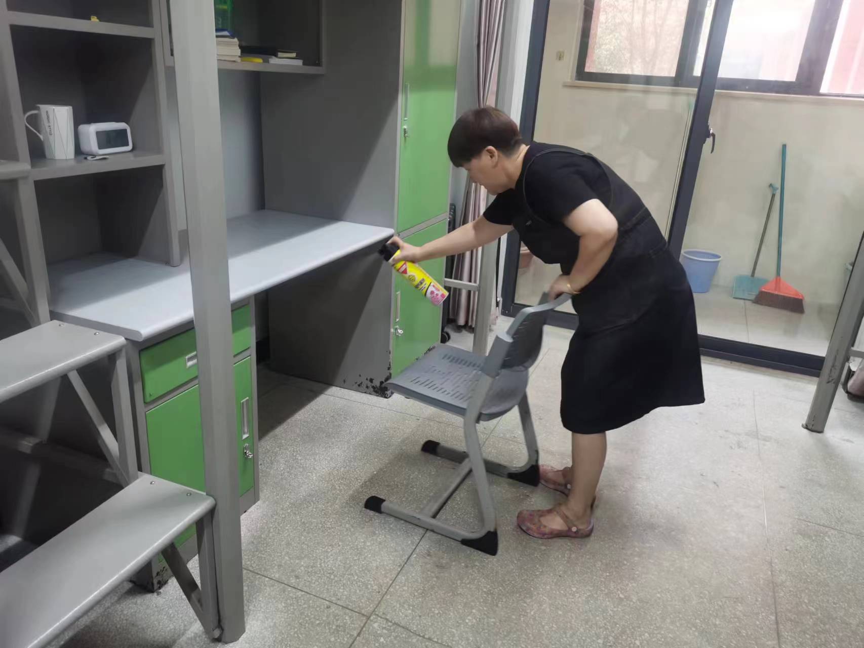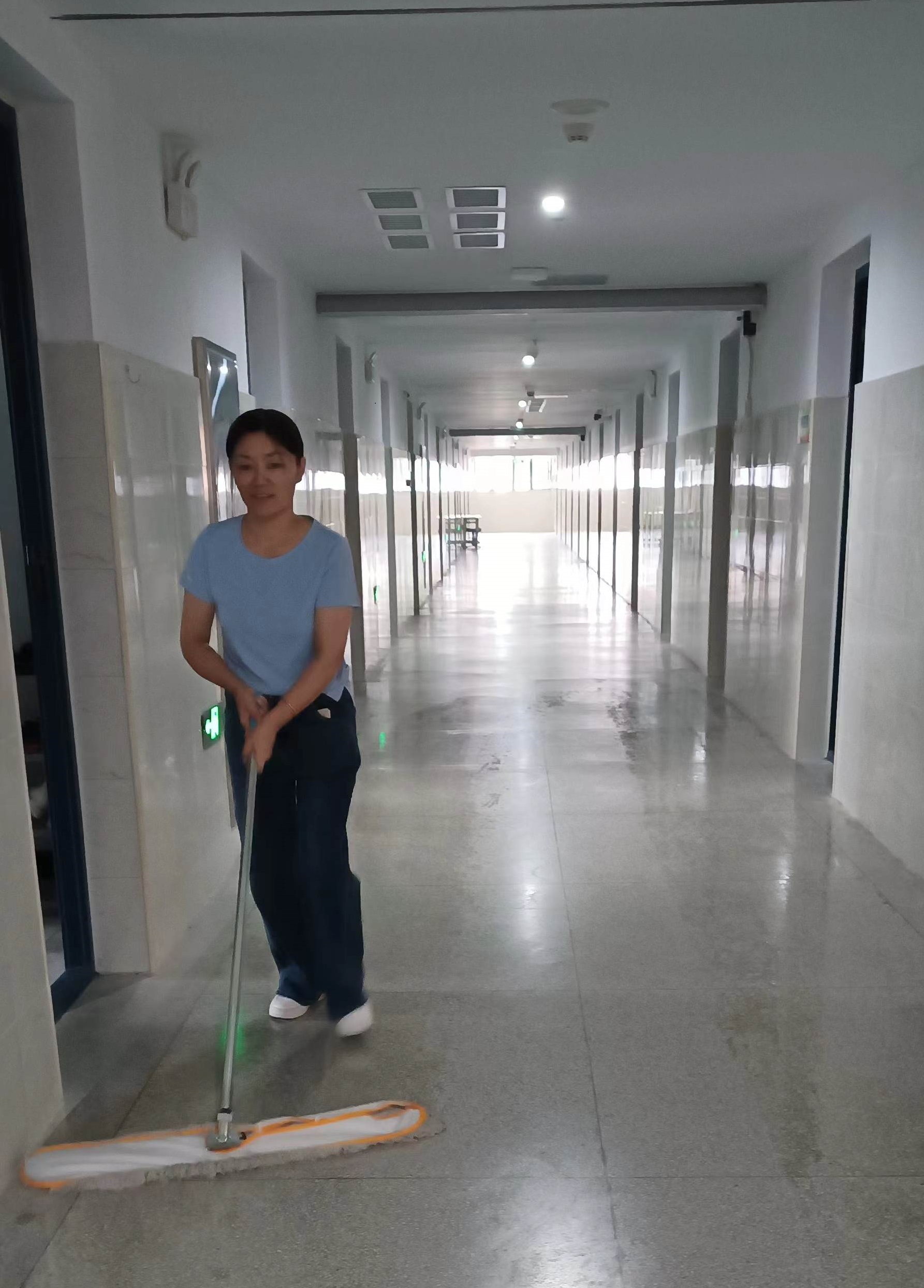 当同学们在教室安心上课时,她们在空旷的宿舍楼里检查打扫公共卫生,营造良好的卫生环境