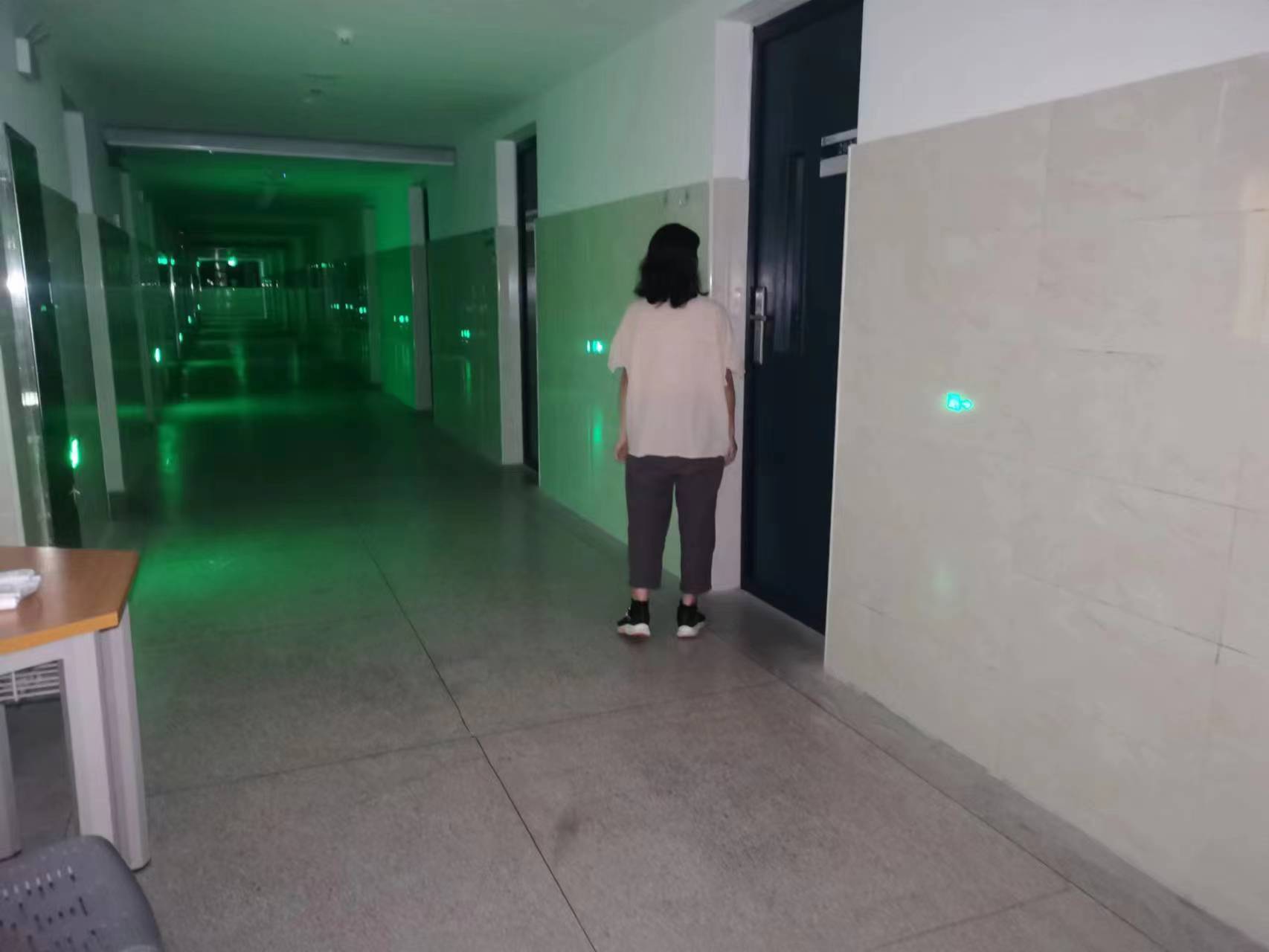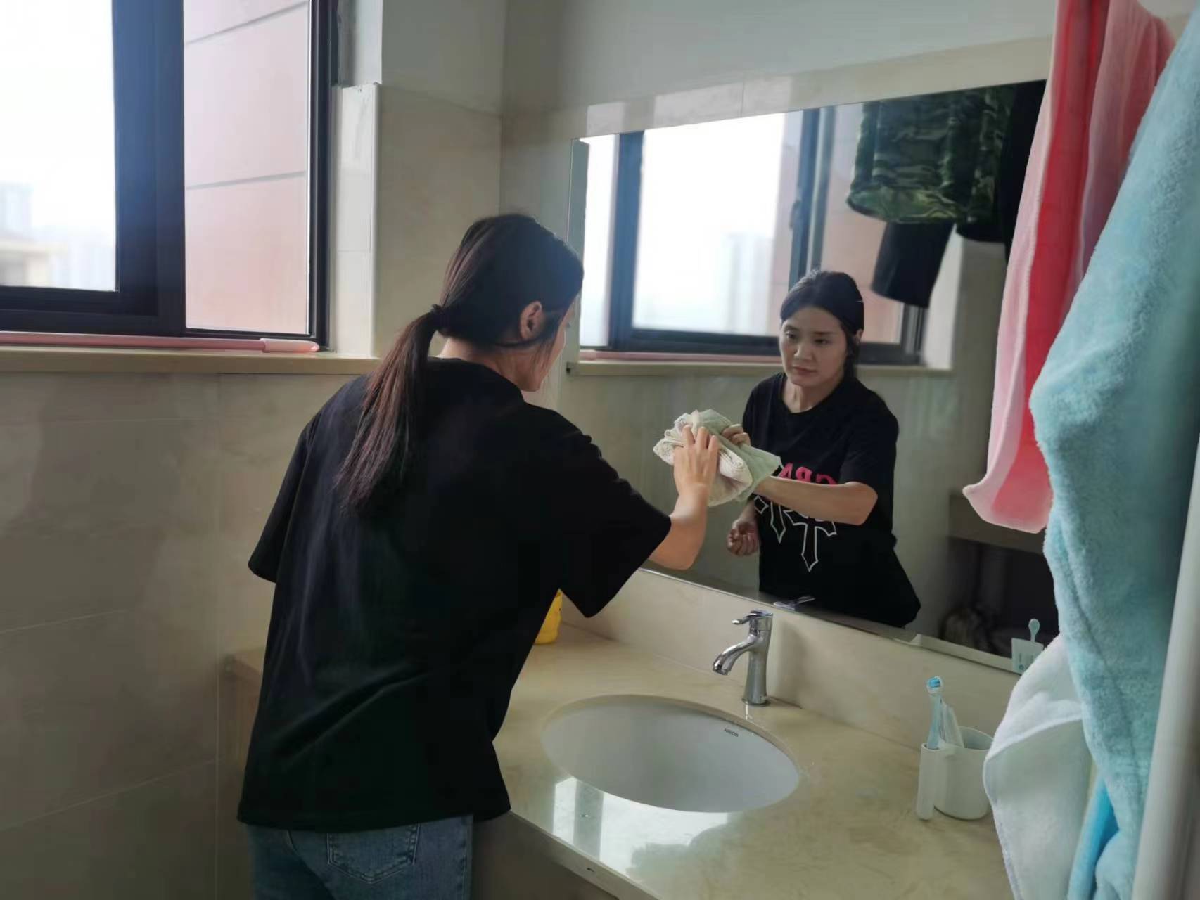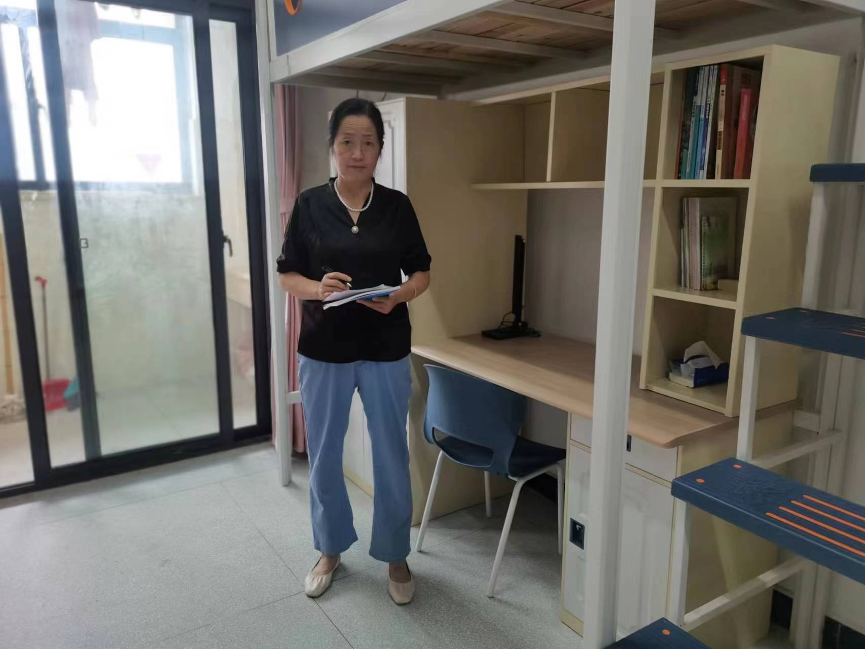 当同学们在教室安心上课时,她们在空旷的宿舍楼里检查打扫公共卫生,营造良好的卫生环境