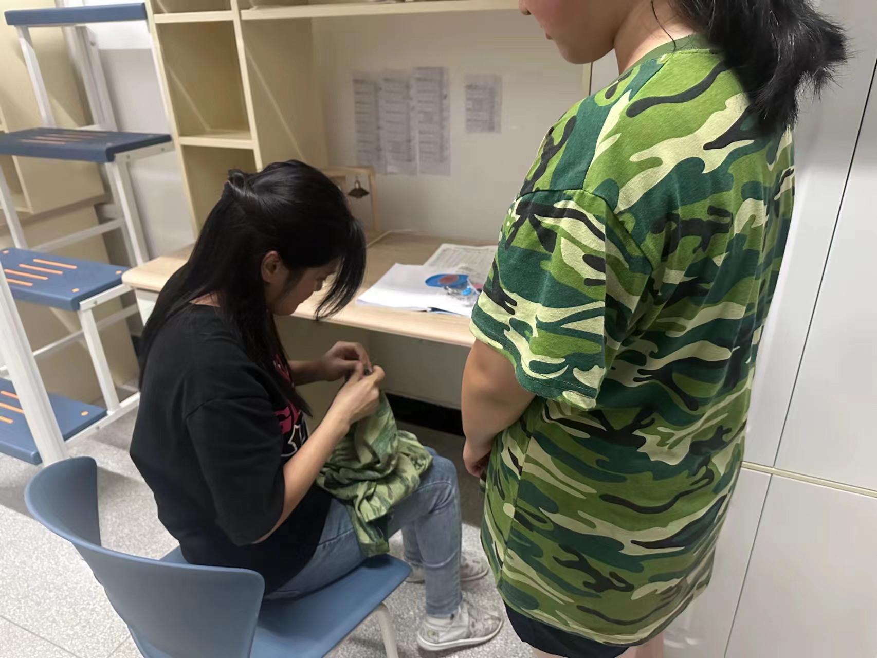 当同学们衣服破损时,他们细致缝补,传递着慈母般的爱