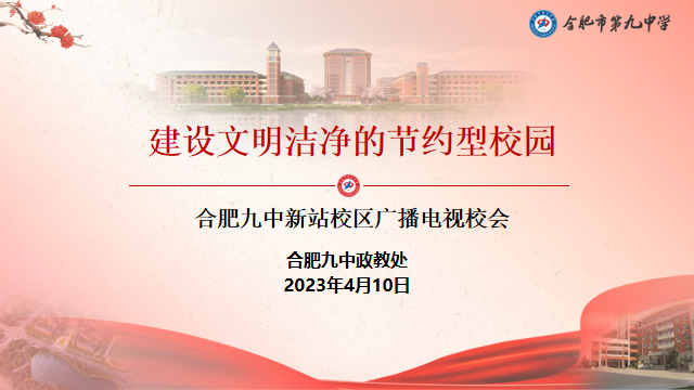 为认真贯彻习近平总书记关于制止餐饮浪费和爱国卫生运动的重要指示批示精神,落实立德树人根本任务,建设绿色校园,让节约资源、保护环境的生态文明理念在校园里蔚然成风,4月10日下午,合肥九中开展“建设文明洁净的节约型校园”主题校会。校会由政教处主任马亚亮主讲。