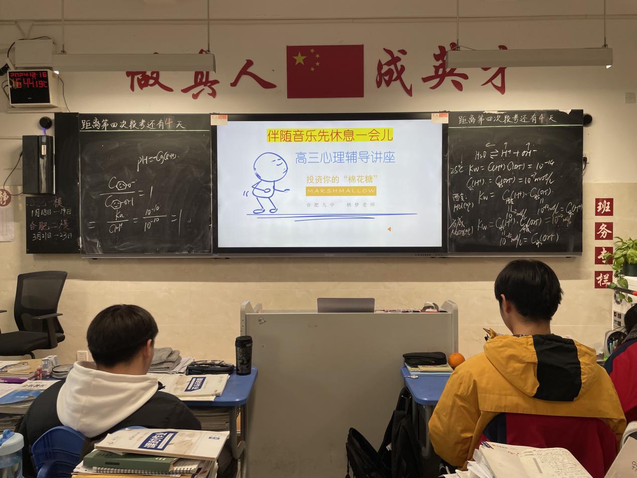 2024年12月16日下午,合肥市第九中学利用班会课时间开展了主题为“投资你的棉花糖”的高三年级心理辅导讲座。本次讲座由学校专职心理健康教师徐梦琨主讲,旨在帮助高三学子有效应对期末及一模考试带来的焦虑情绪,重拾初心,拒绝低效状态,以更加积极的心态迎接挑战。